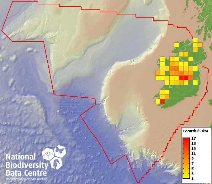 Distribution of the number of records recorded within each 10km grid square (ITM).Marine Map - 50km