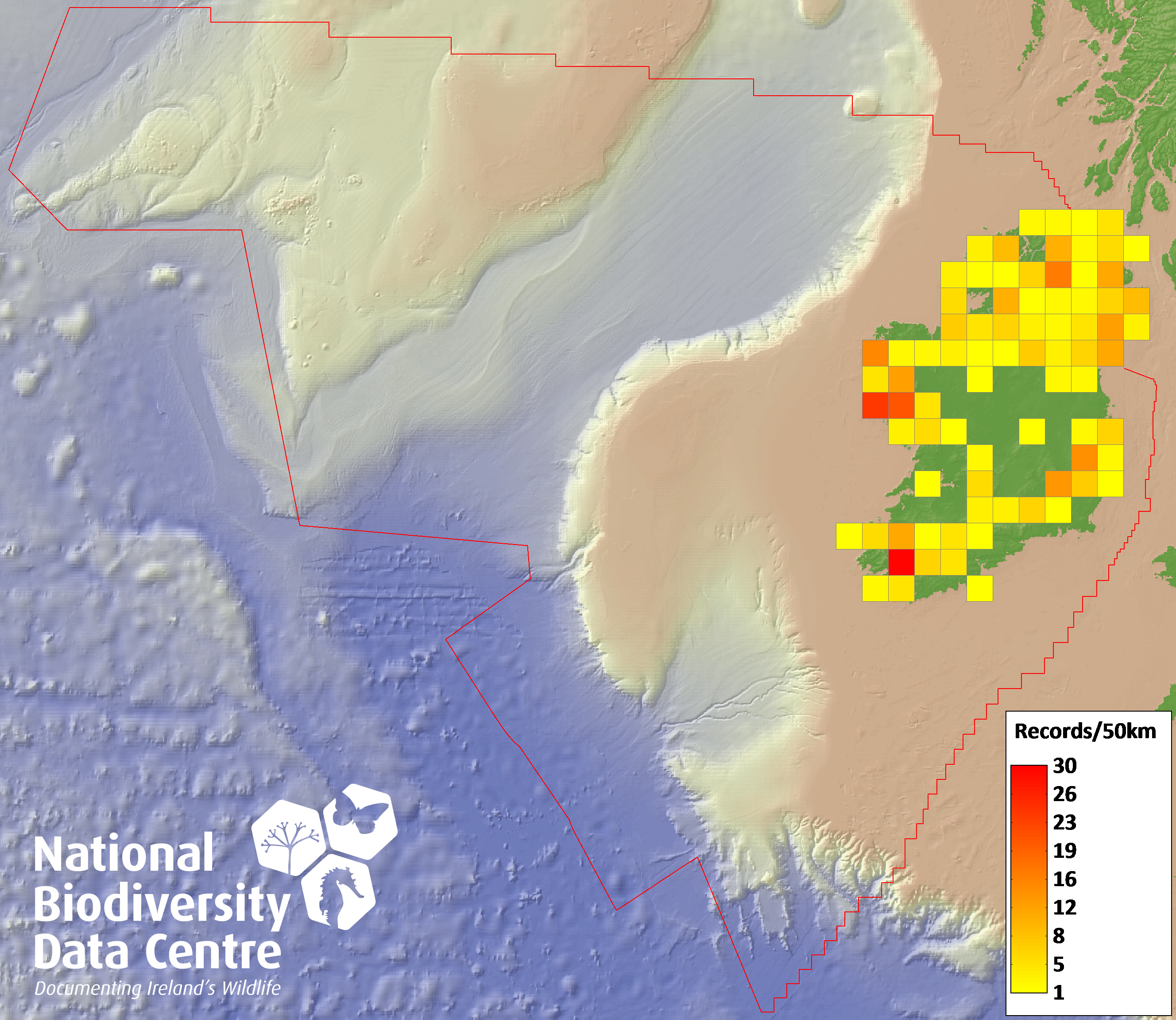 Distribution of the number of records recorded within each 10km grid square (ITM).Marine Map - 50km