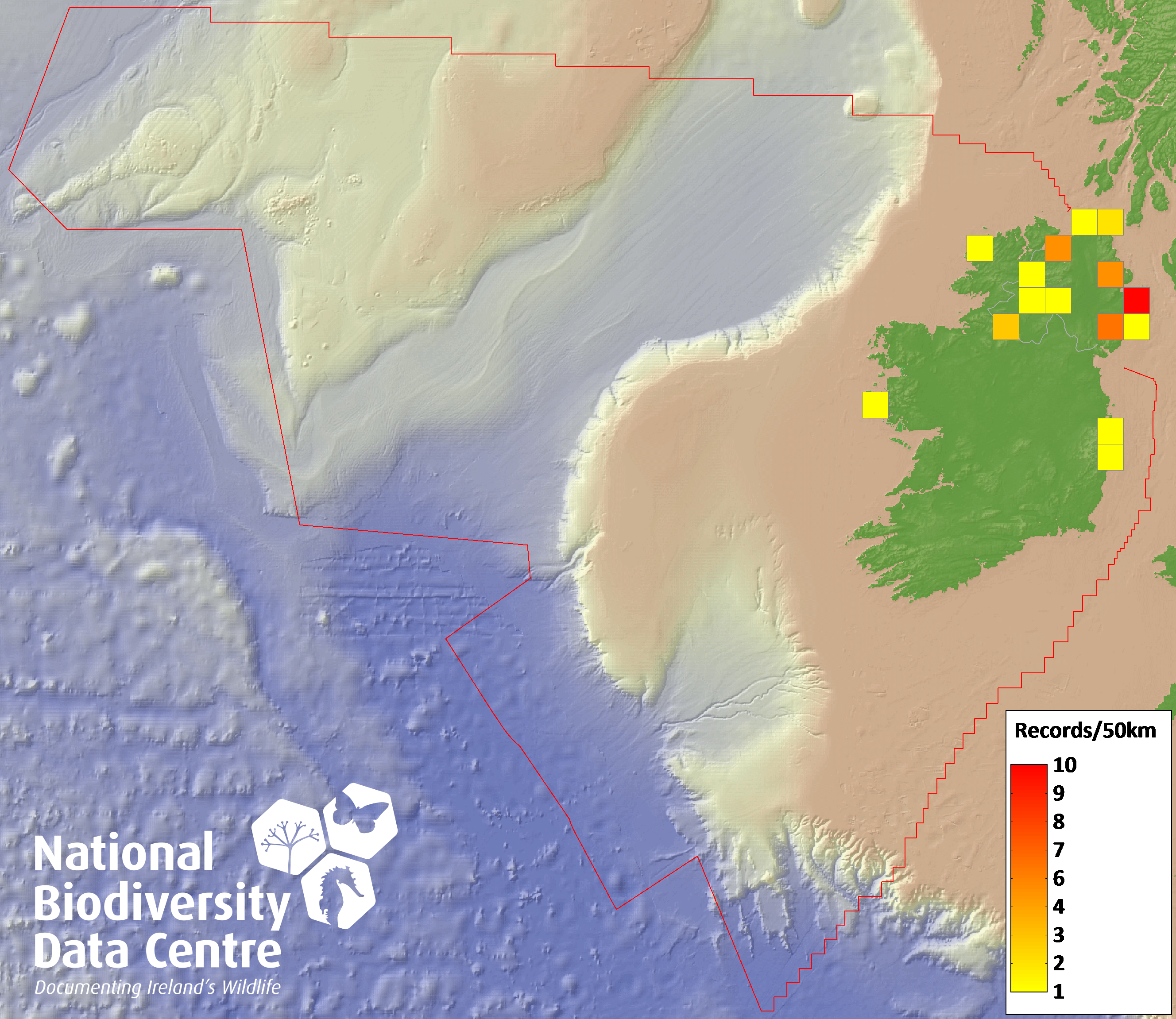 Distribution of the number of records recorded within each 10km grid square (ITM).Marine Map - 50km