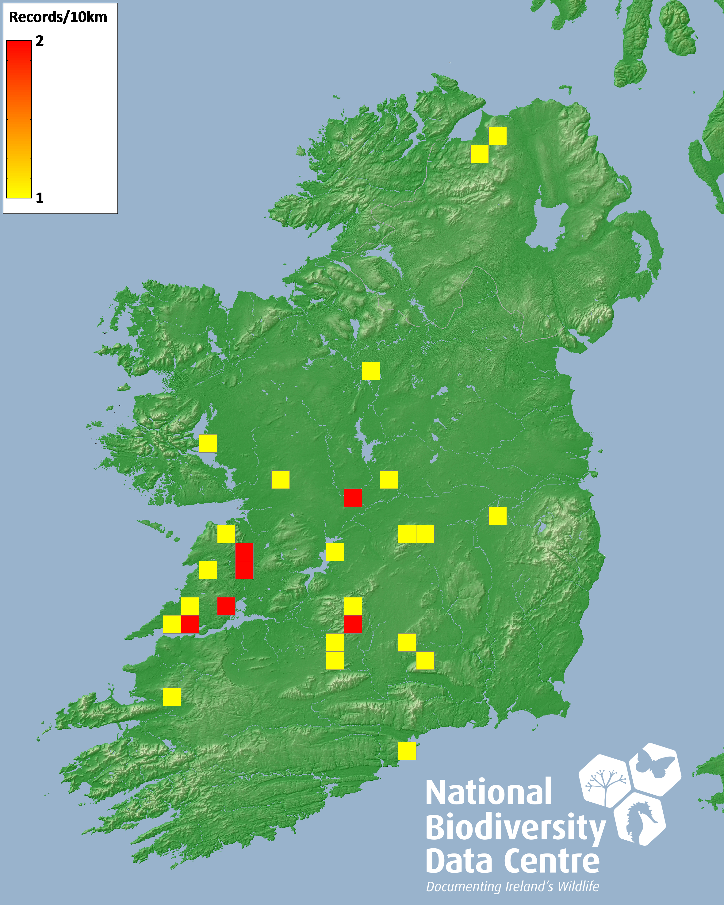 Distribution of the number of records recorded within each 10km grid square (ITM).Marine Map - 50km