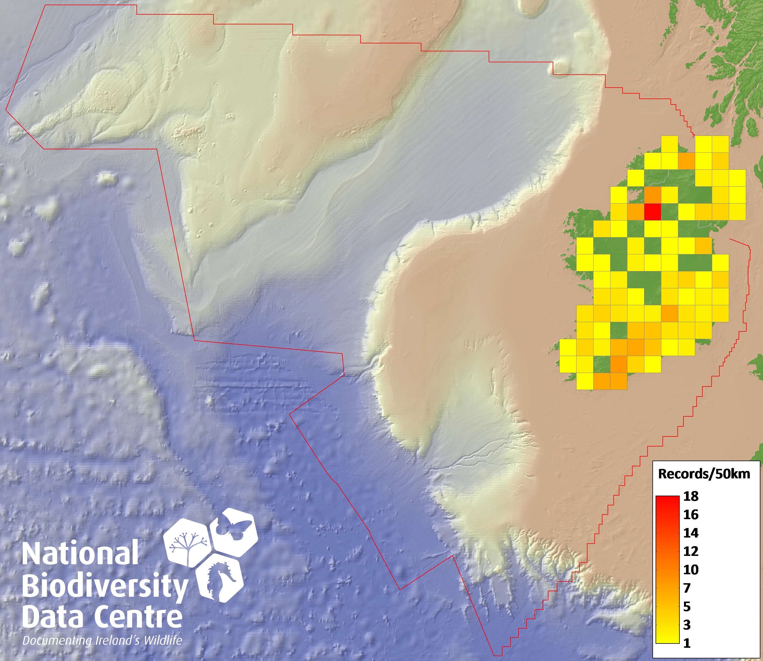 Distribution of the number of records recorded within each 10km grid square (ITM).Marine Map - 50km