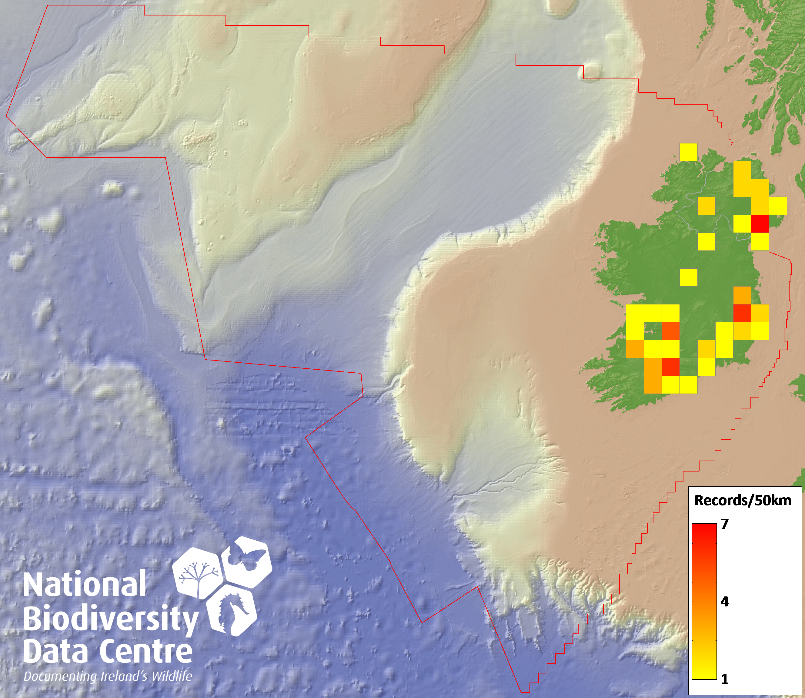 Distribution of the number of records recorded within each 10km grid square (ITM).Marine Map - 50km