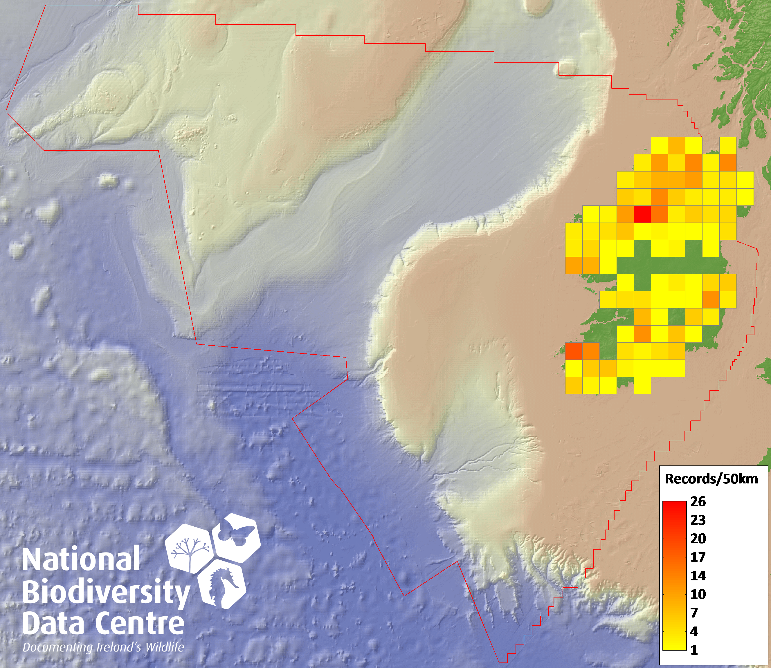 Distribution of the number of records recorded within each 10km grid square (ITM).Marine Map - 50km