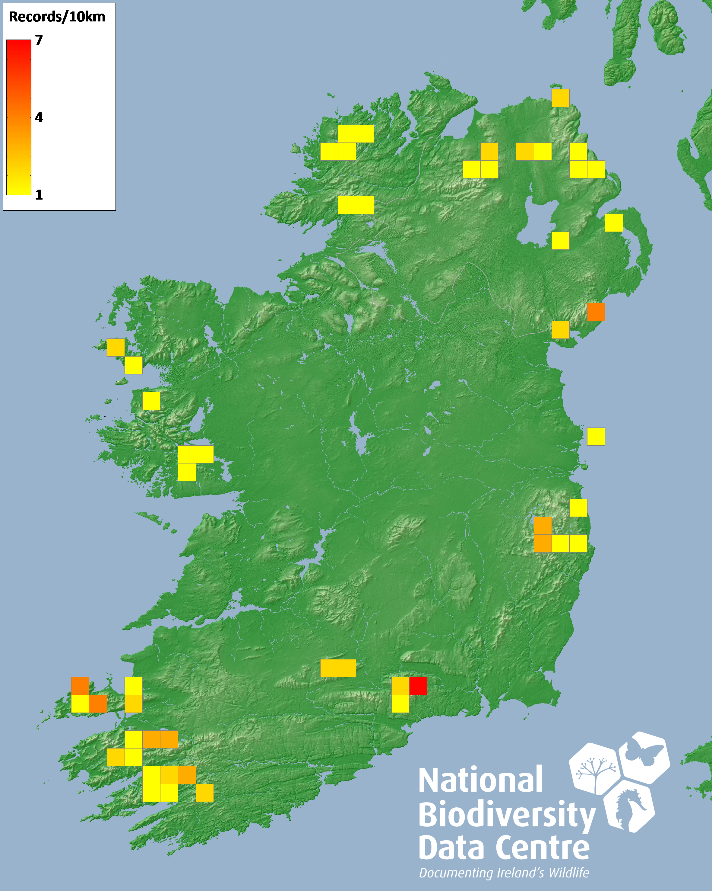 Distribution of the number of records recorded within each 10km grid square (ITM).Marine Map - 50km
