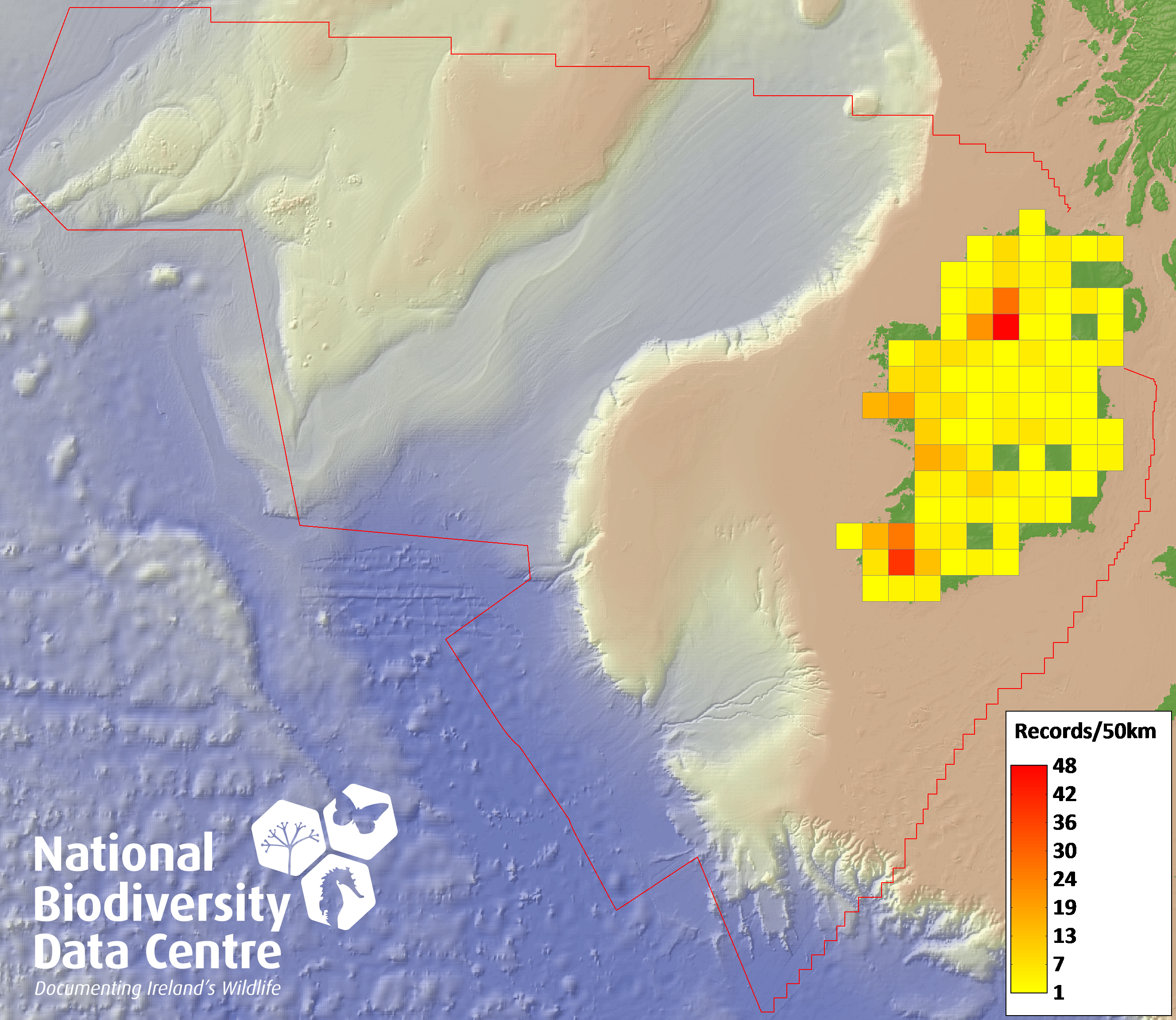 Distribution of the number of records recorded within each 10km grid square (ITM).Marine Map - 50km