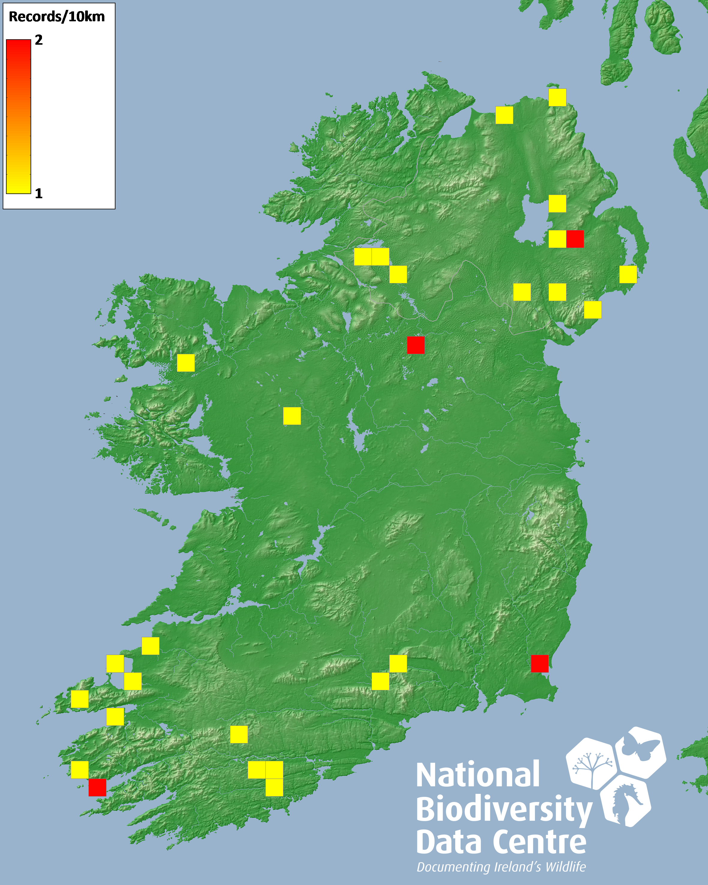 Distribution of the number of records recorded within each 10km grid square (ITM).Marine Map - 50km
