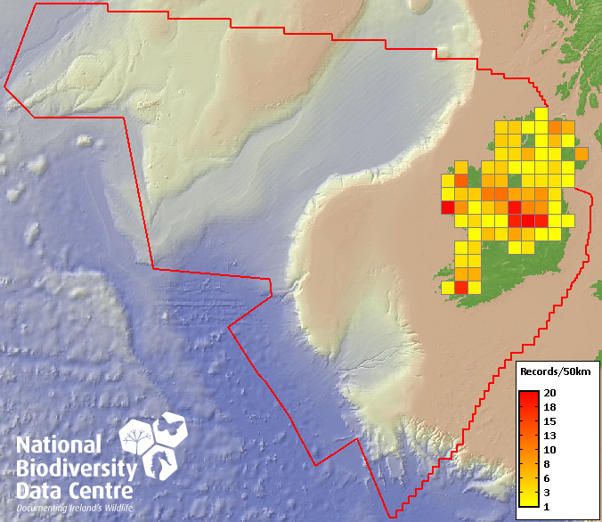 Distribution of the number of records recorded within each 10km grid square (ITM).Marine Map - 50km