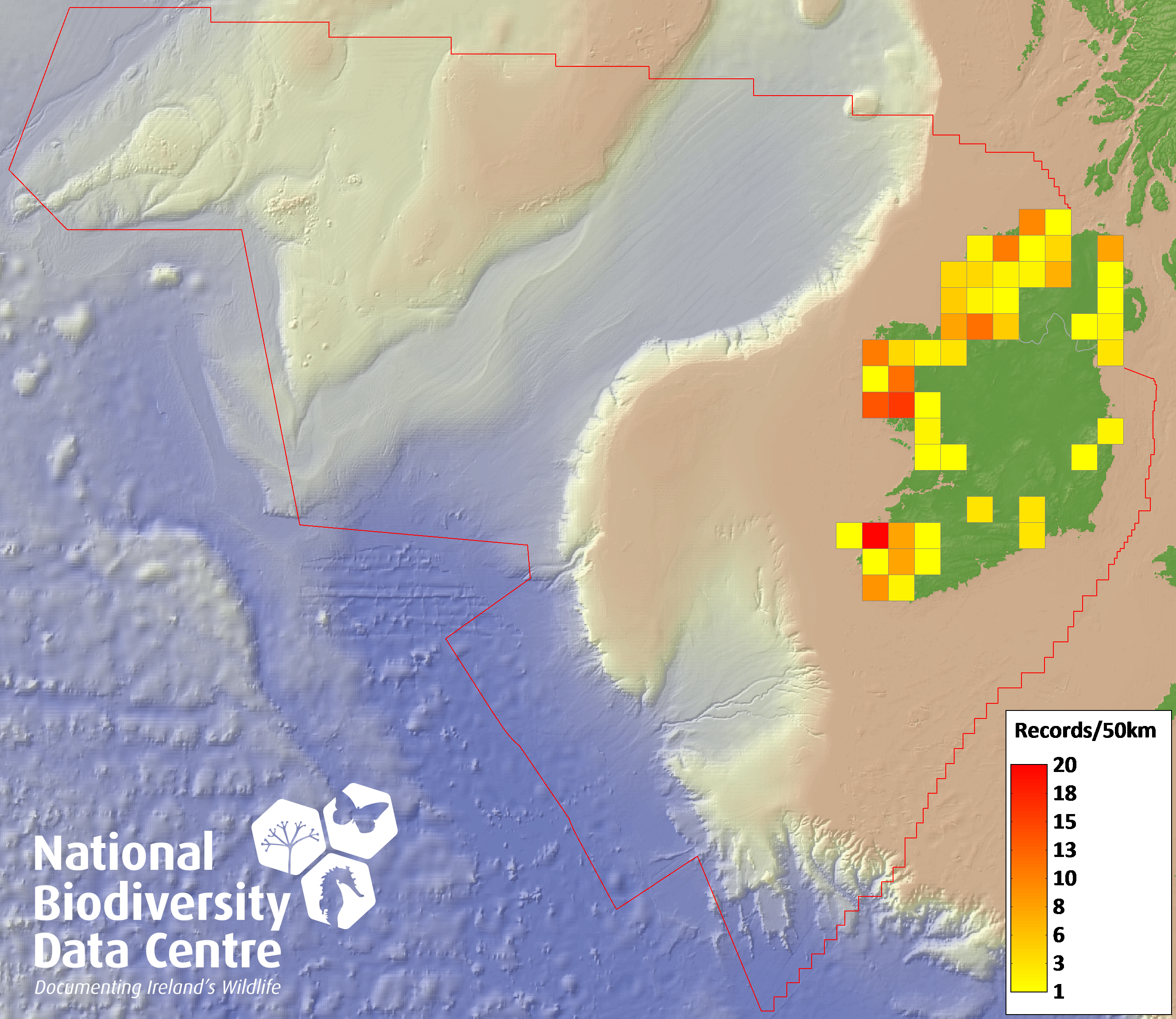 Distribution of the number of records recorded within each 10km grid square (ITM).Marine Map - 50km