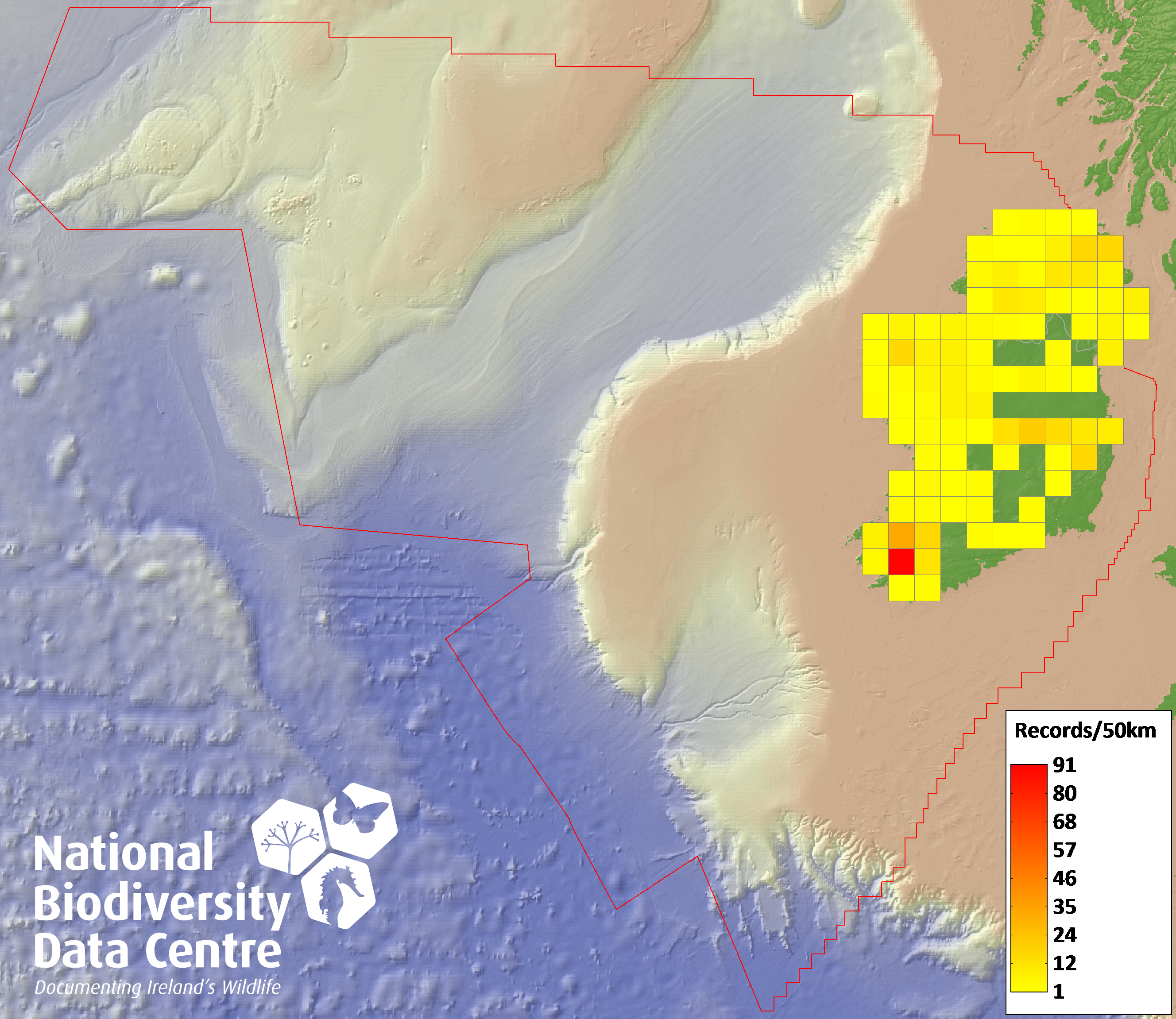 Distribution of the number of records recorded within each 10km grid square (ITM).Marine Map - 50km