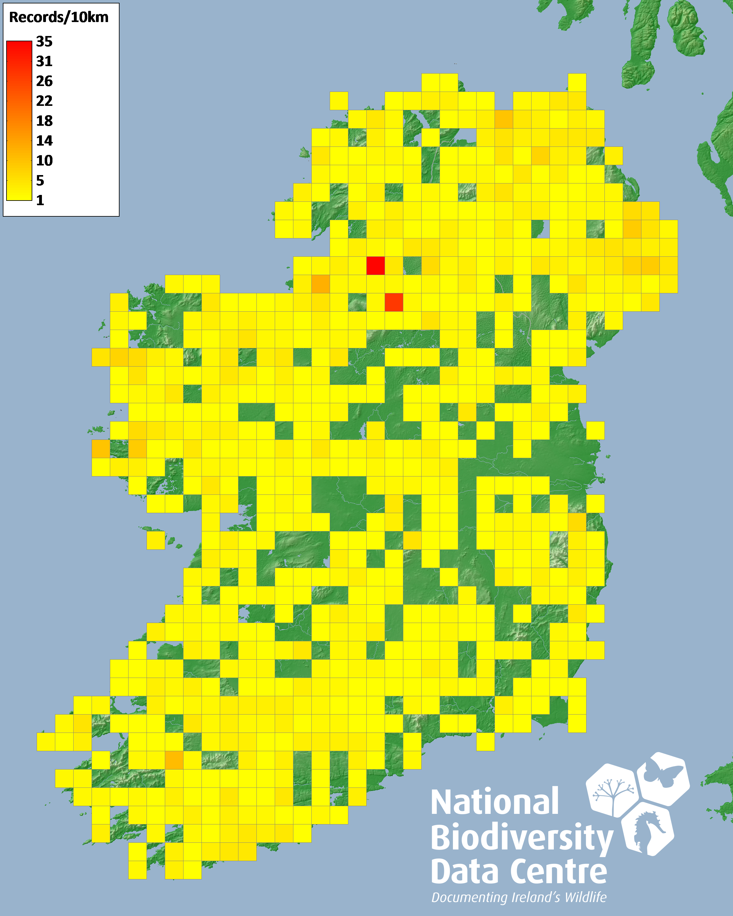 Distribution of the number of records recorded within each 10km grid square (ITM).Marine Map - 50km