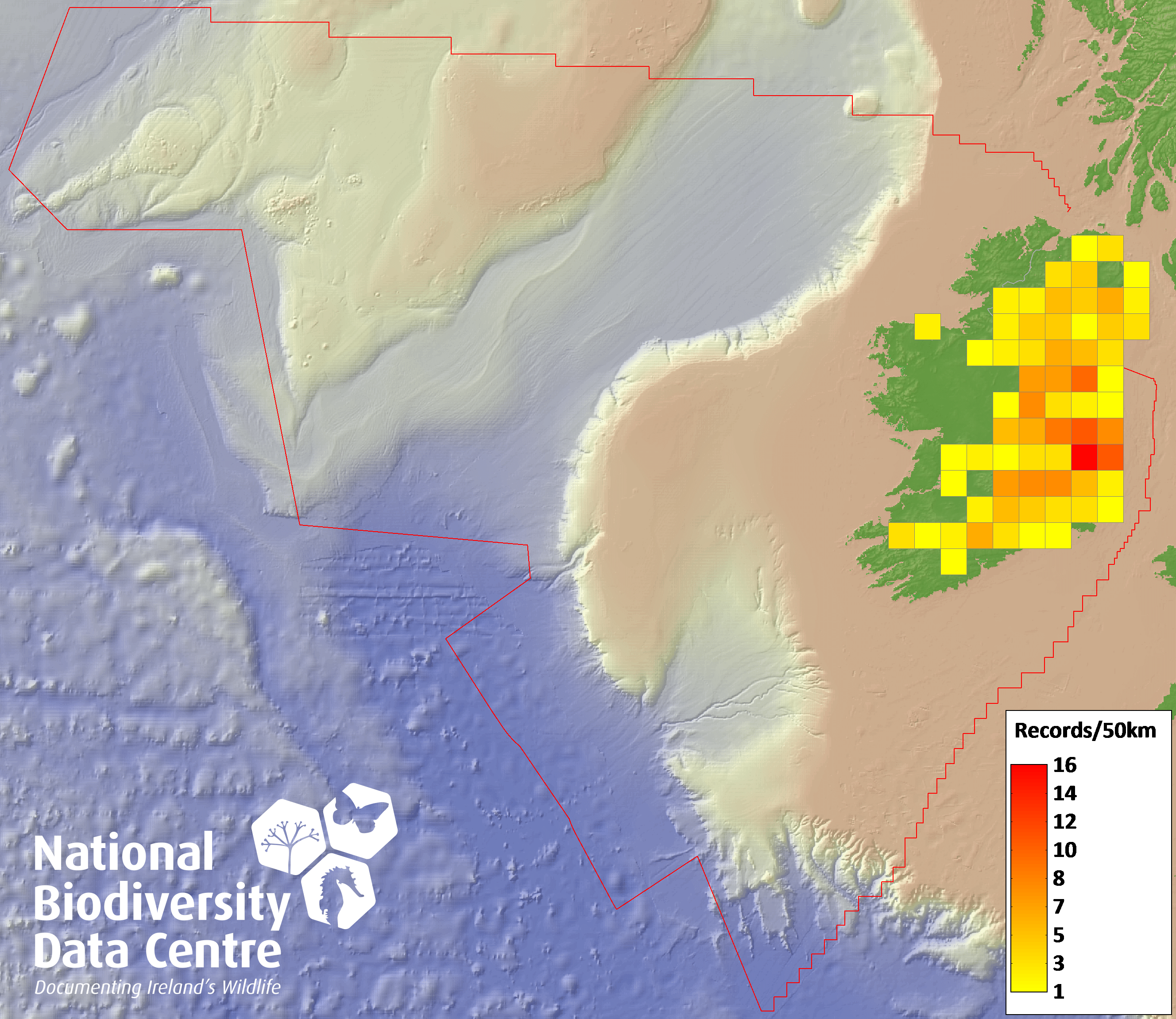 Distribution of the number of records recorded within each 10km grid square (ITM).Marine Map - 50km