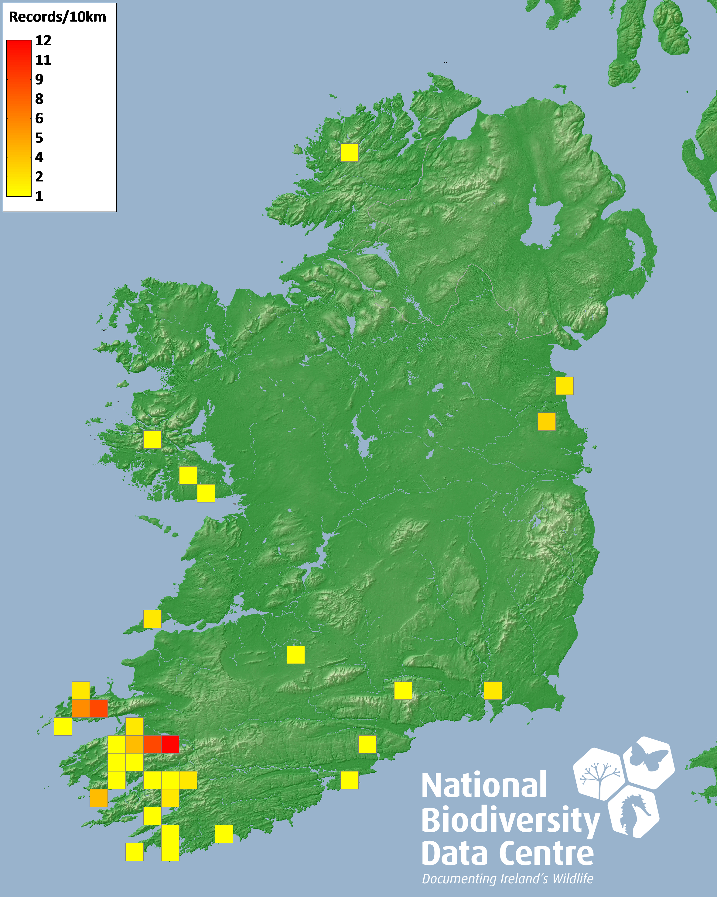 Distribution of the number of records recorded within each 10km grid square (ITM).Marine Map - 50km