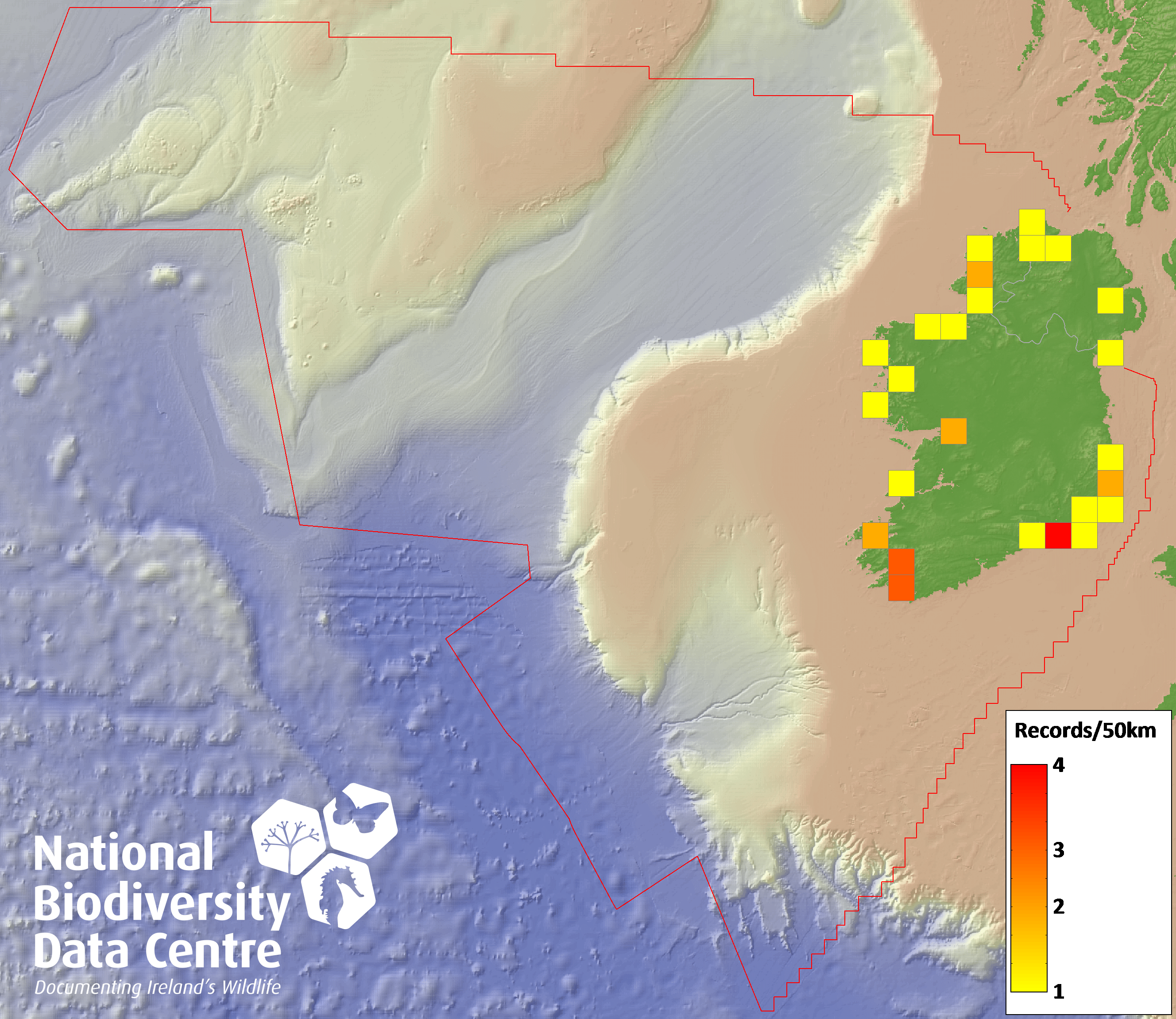 Distribution of the number of records recorded within each 10km grid square (ITM).Marine Map - 50km