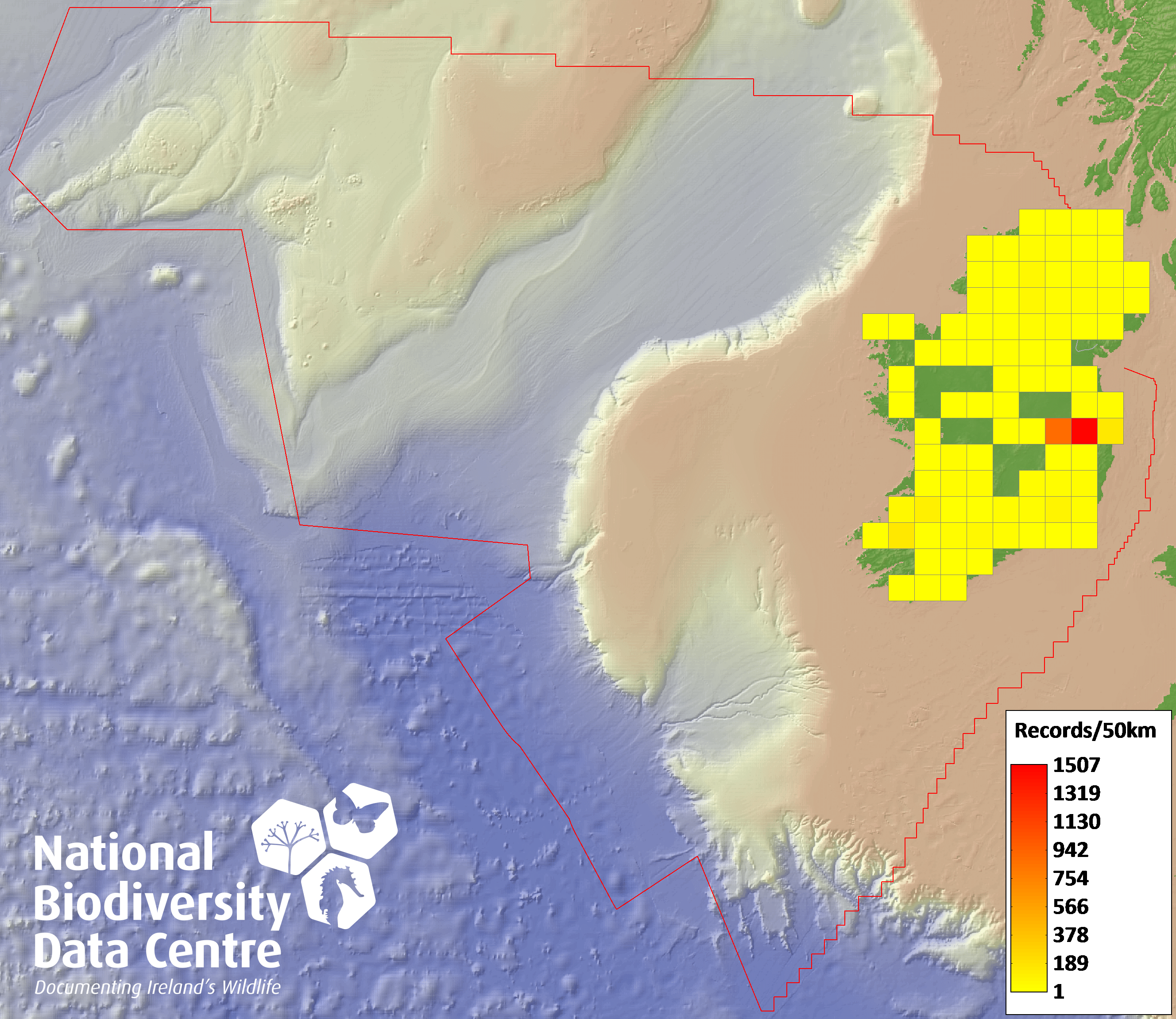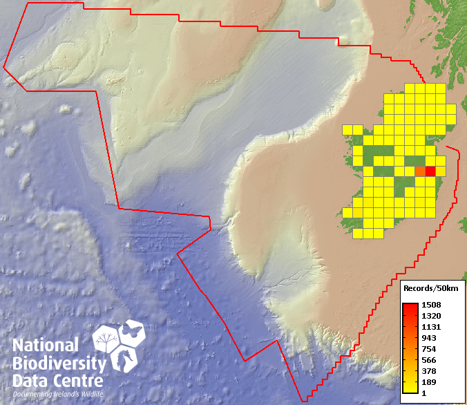 Distribution of the number of records recorded within each 10km grid square (ITM).Marine Map - 50km
