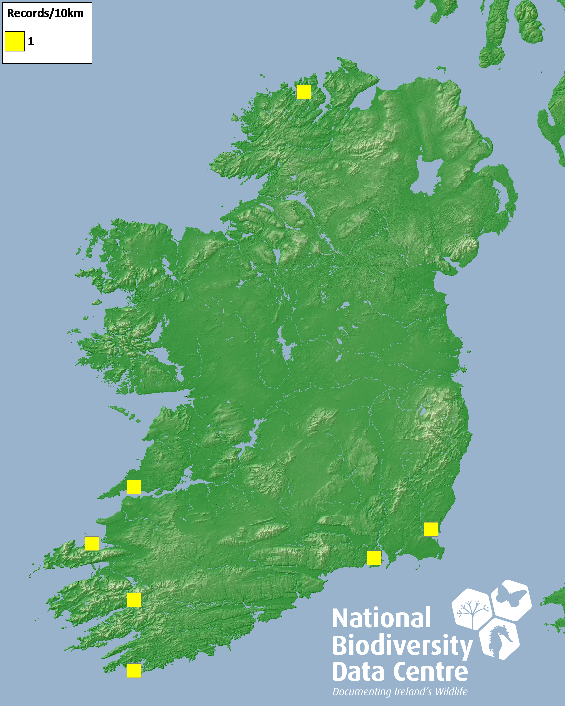 Distribution of the number of records recorded within each 10km grid square (ITM).Marine Map - 50km