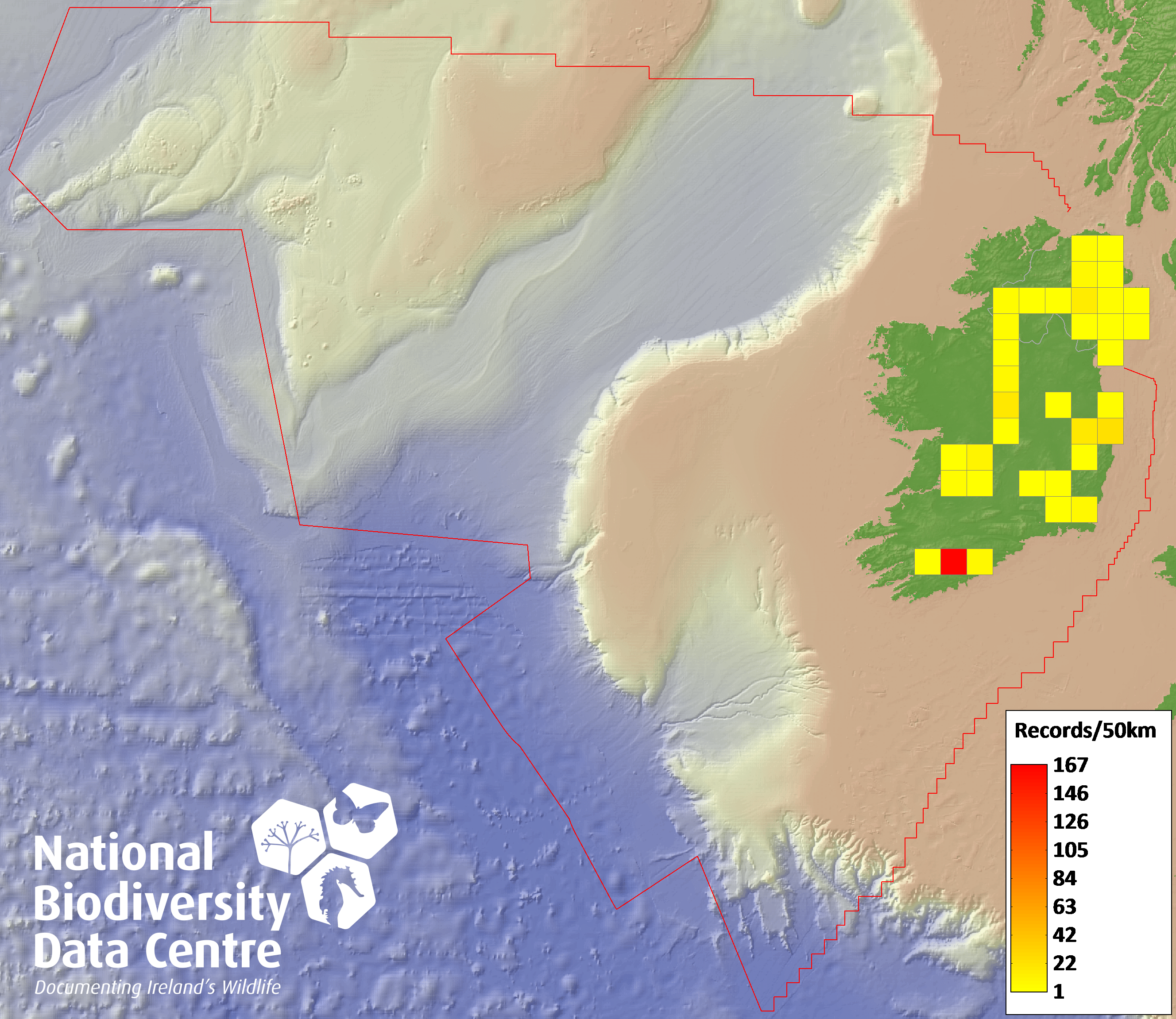 Distribution of the number of records recorded within each 10km grid square (ITM).Marine Map - 50km