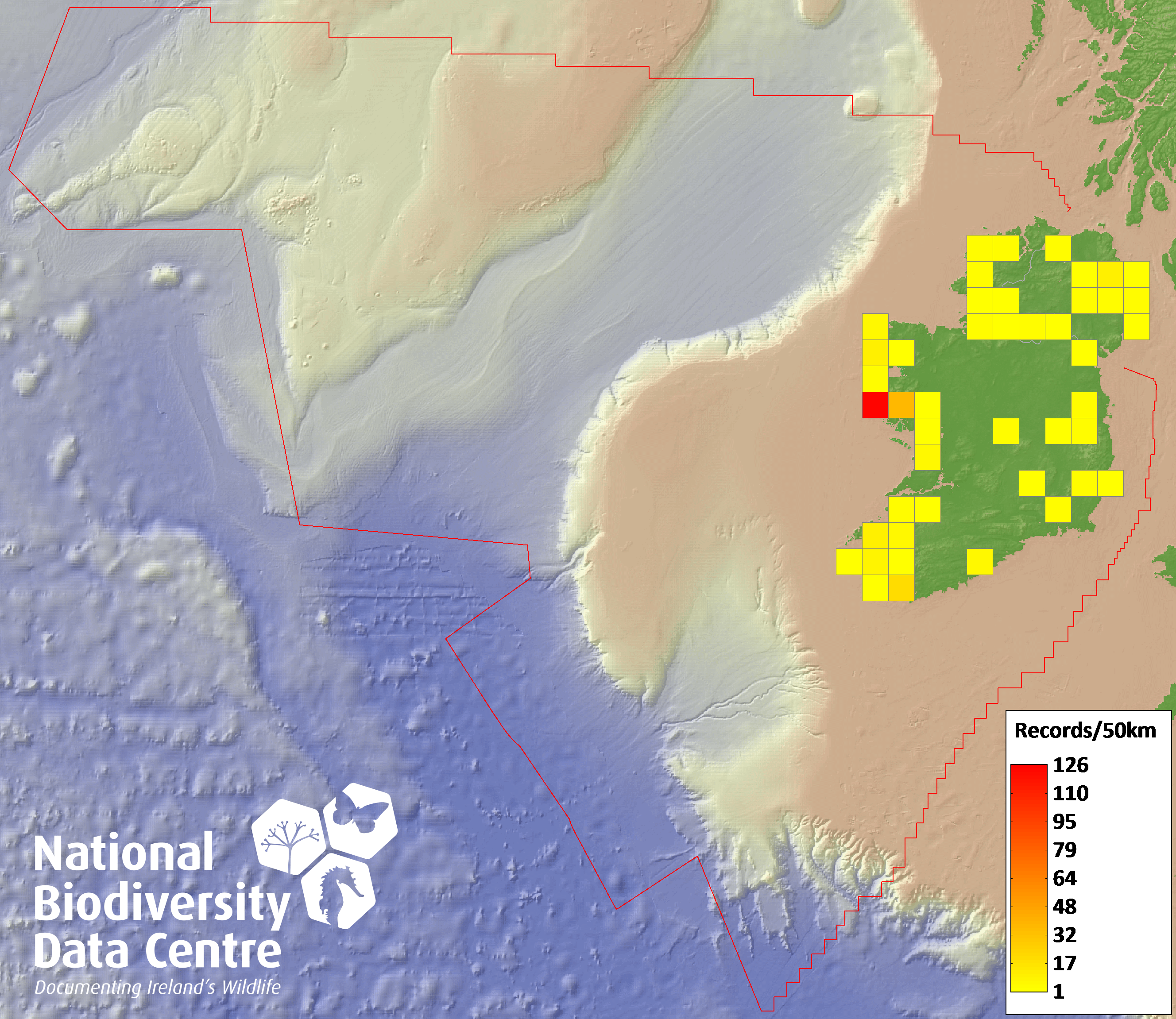 Distribution of the number of records recorded within each 10km grid square (ITM).Marine Map - 50km