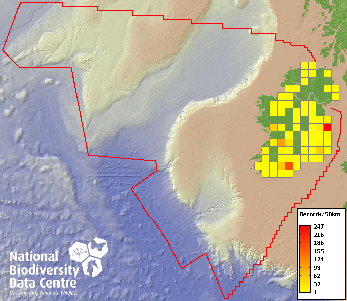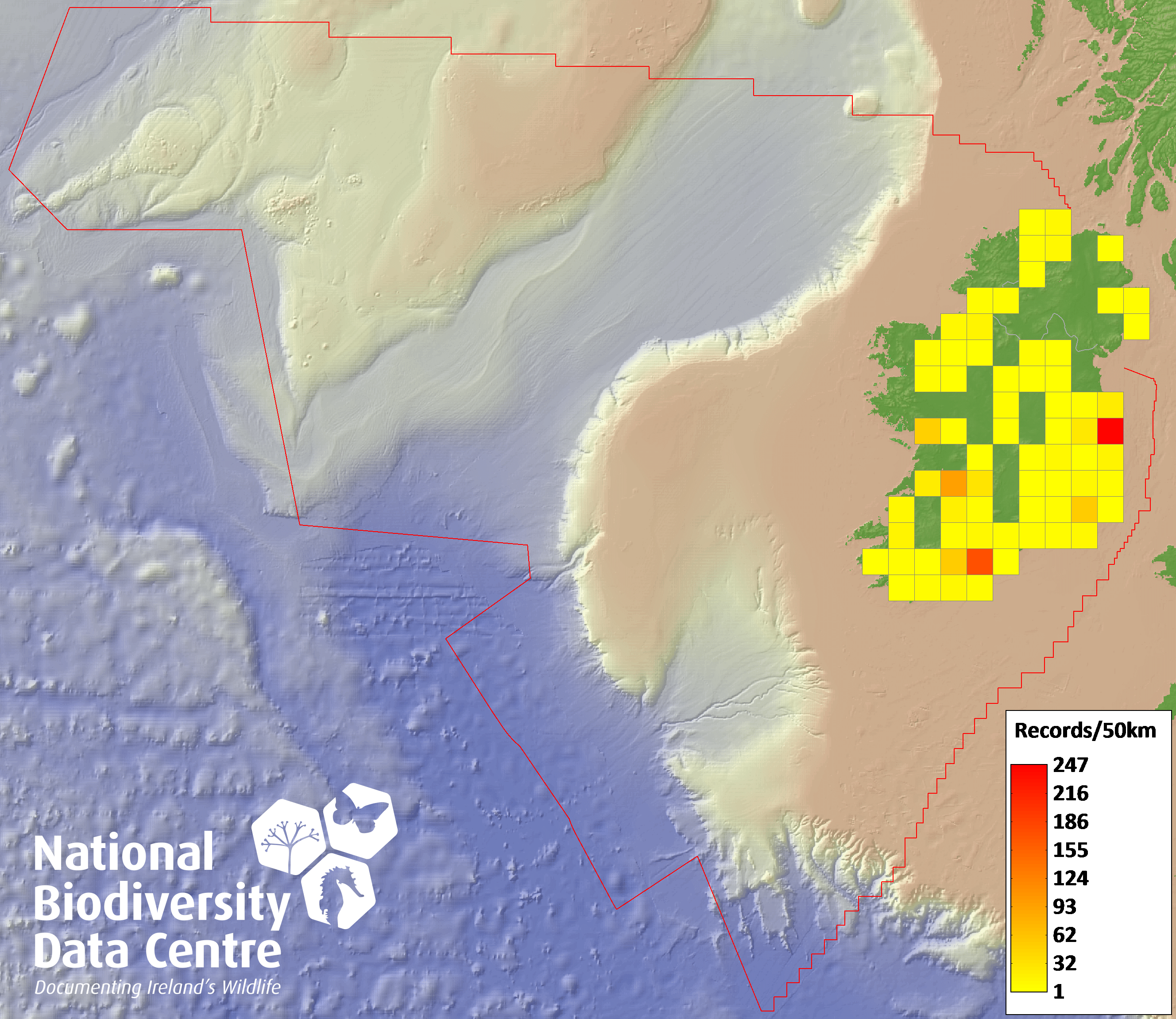 Distribution of the number of records recorded within each 10km grid square (ITM).Marine Map - 50km