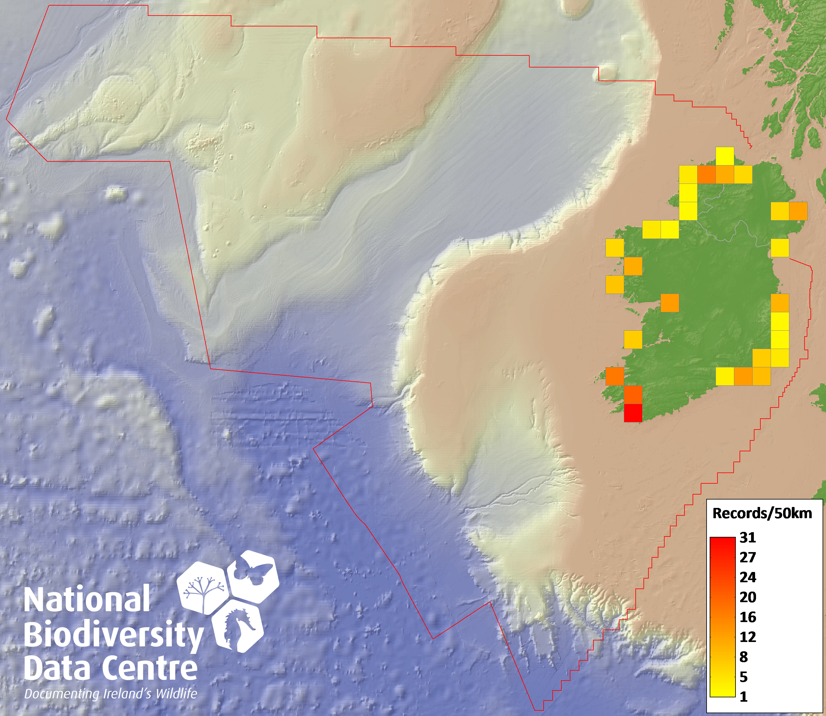 Distribution of the number of records within each 10km grid square (ITM).Marine Map - 50Km
