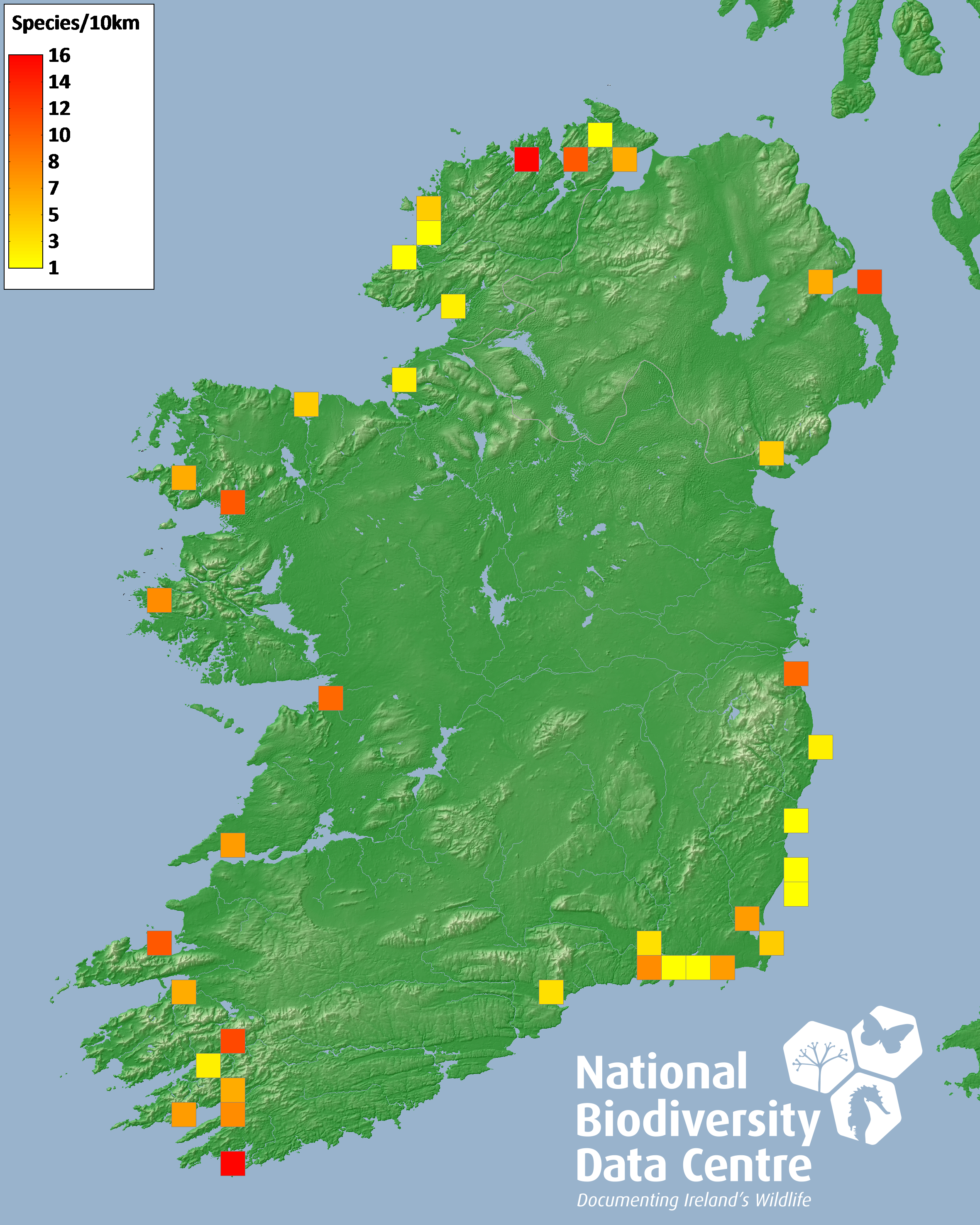 Distribution of the number of species recorded within each 10km grid square (ITM).Marine Map - 50Km