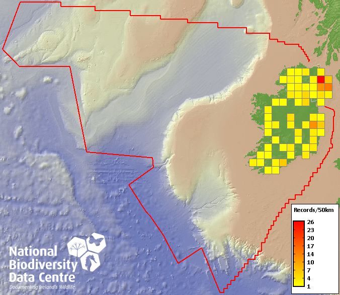 Distribution of the number of records within each 10km grid square (ITM).Marine Map - 50Km