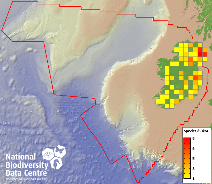 Distribution of the number of species recorded within each 10km grid square (ITM).Marine Map - 50Km