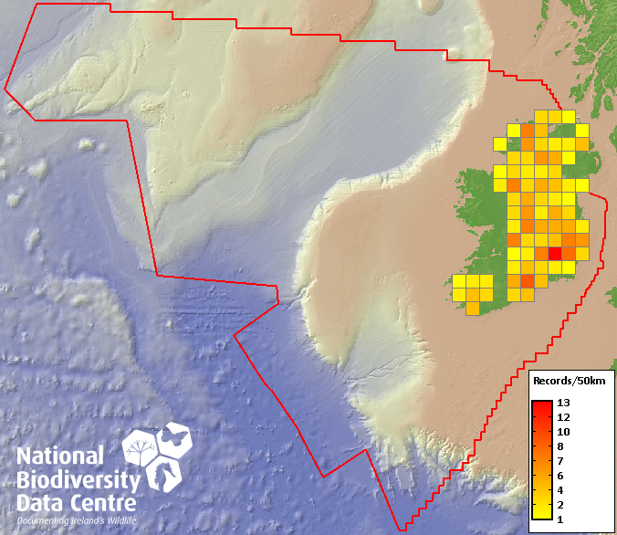 Distribution of the number of records recorded within each 10km grid square (ITM).Marine Map - 50km