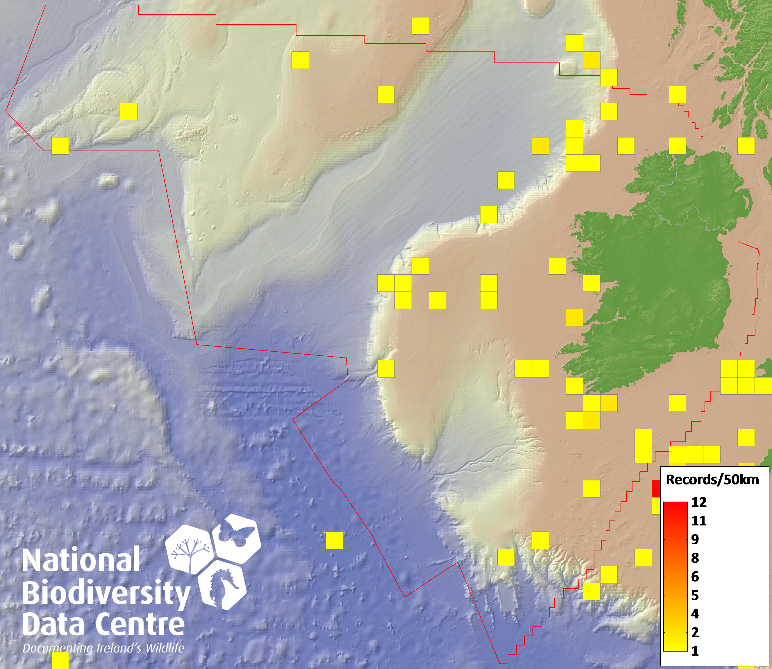 Distribution of the number of records recorded within each 10km grid square (ITM).Marine Map - 50km