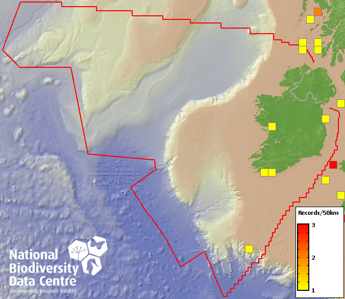 Distribution of the number of records recorded within each 10km grid square (ITM).Marine Map - 50km