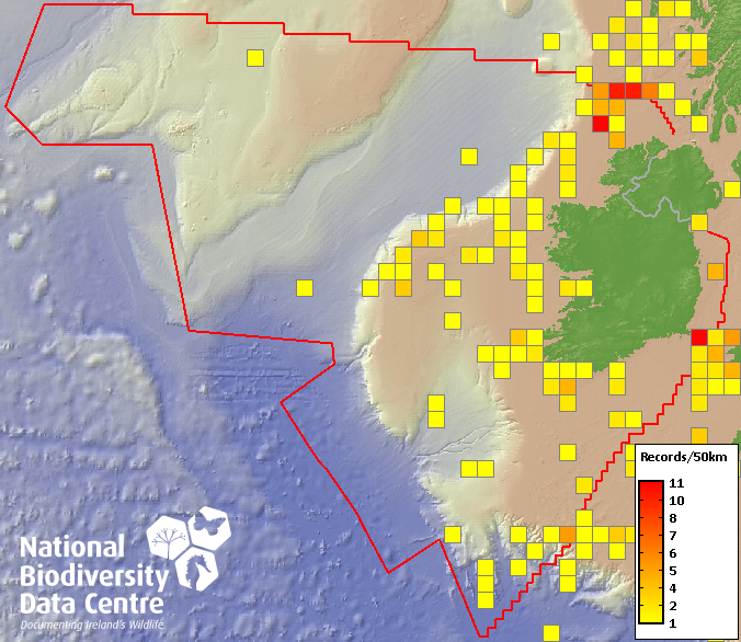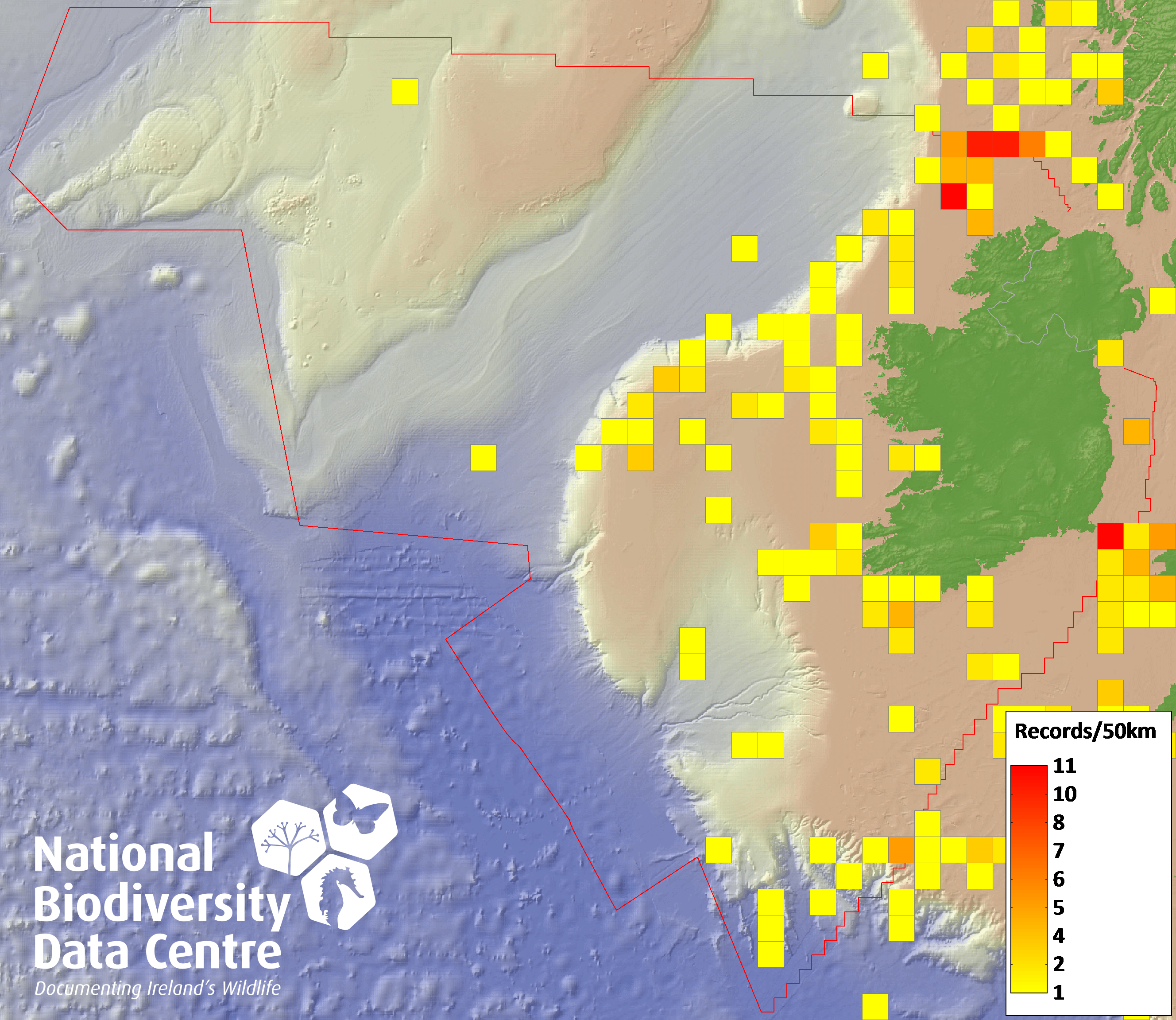 Distribution of the number of records recorded within each 10km grid square (ITM).Marine Map - 50km