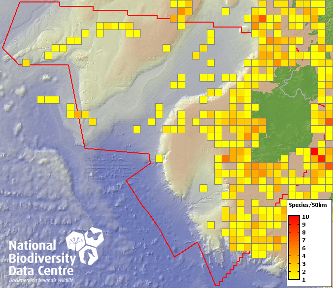 Distribution of the number of records within each 10km grid square (ITM).Marine Map - 50Km