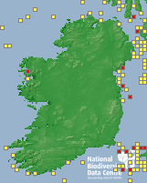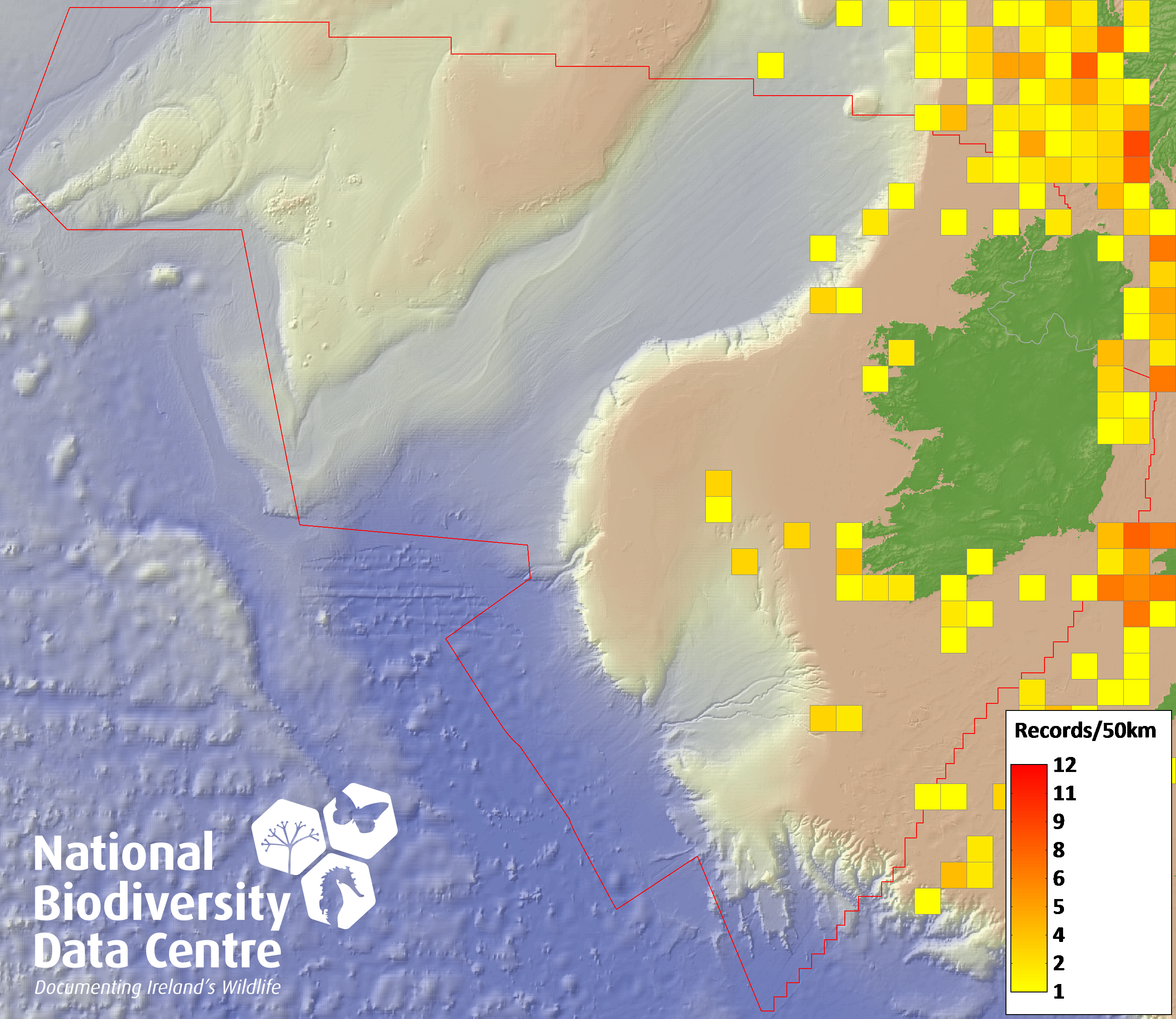 Distribution of the number of records within each 10km grid square (ITM).Marine Map - 50Km