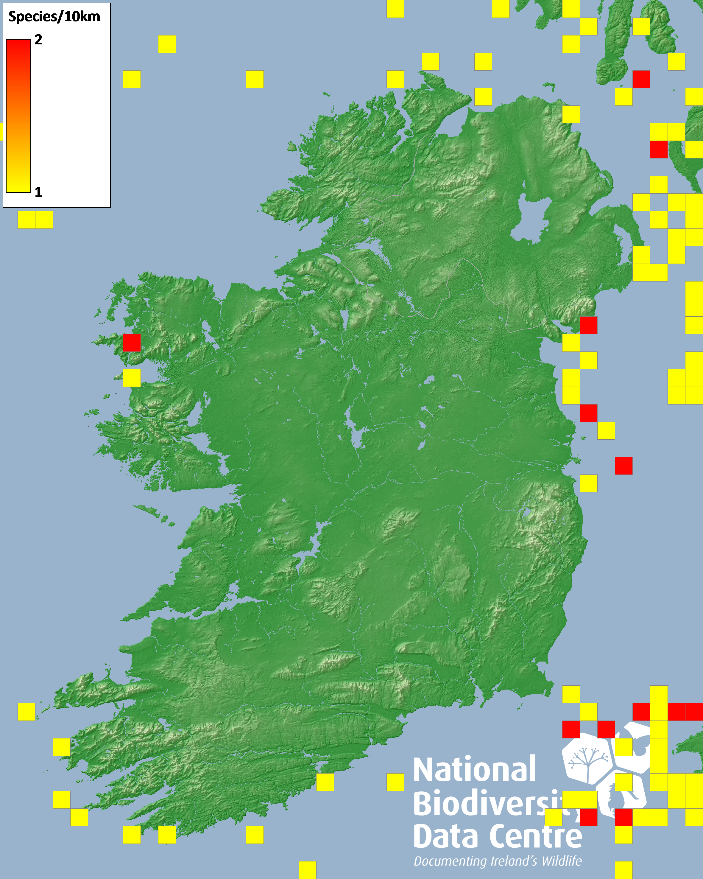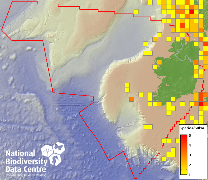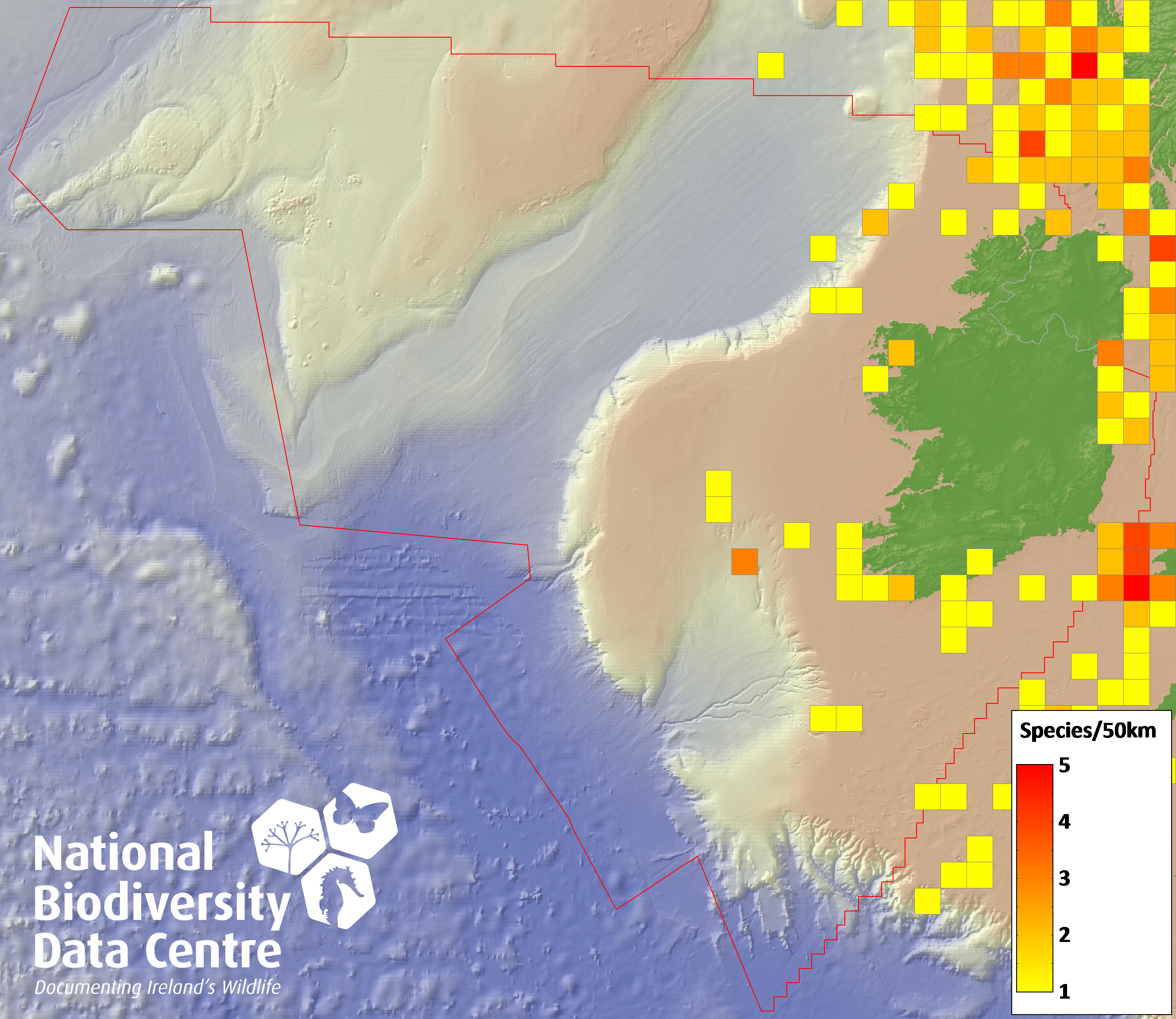 Distribution of the number of species recorded within each 10km grid square (ITM).Marine Map - 50Km