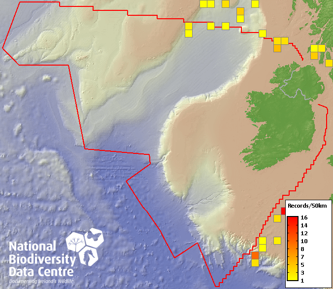 Distribution of the number of records within each 10km grid square (ITM).Marine Map - 50Km