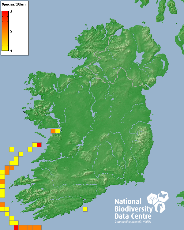 Distribution of the number of records within each 10km grid square (ITM).Marine Map - 50Km