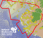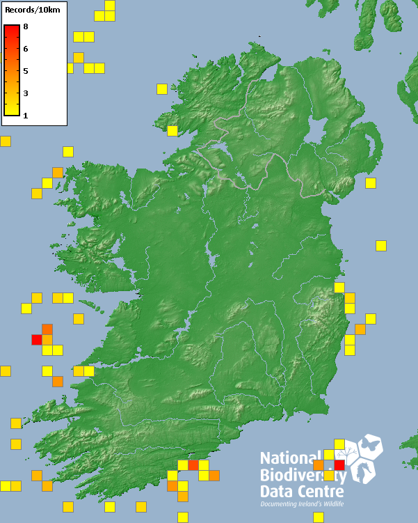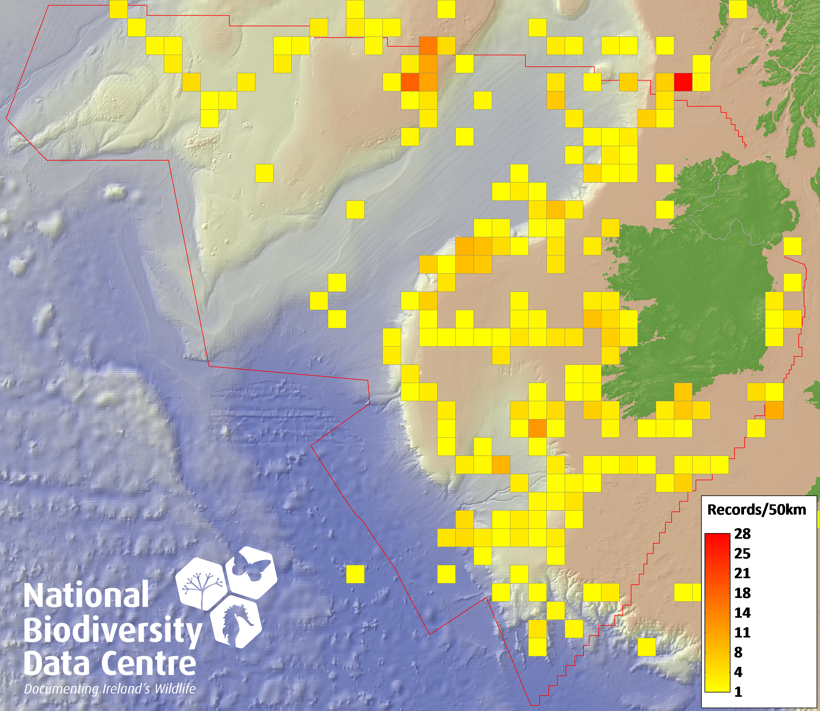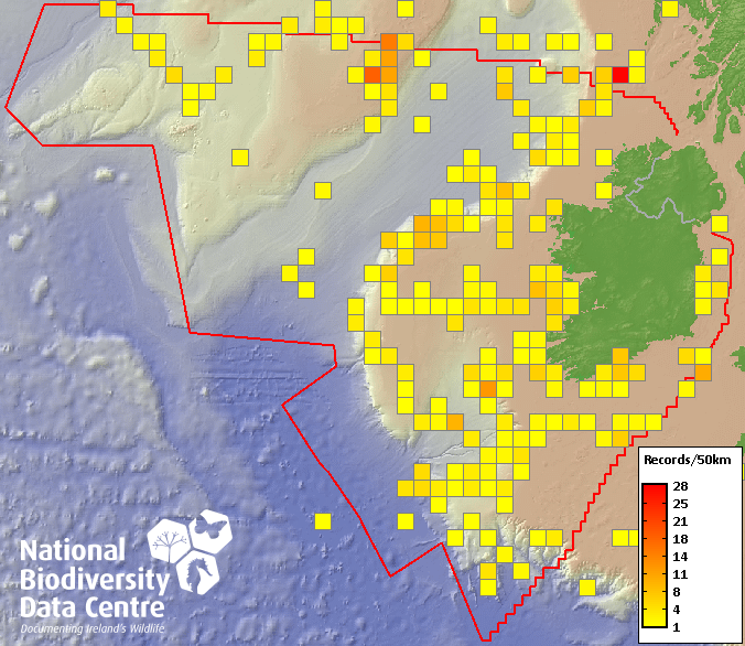 Distribution of the number of records within each 10km grid square (ITM).Marine Map - 50Km