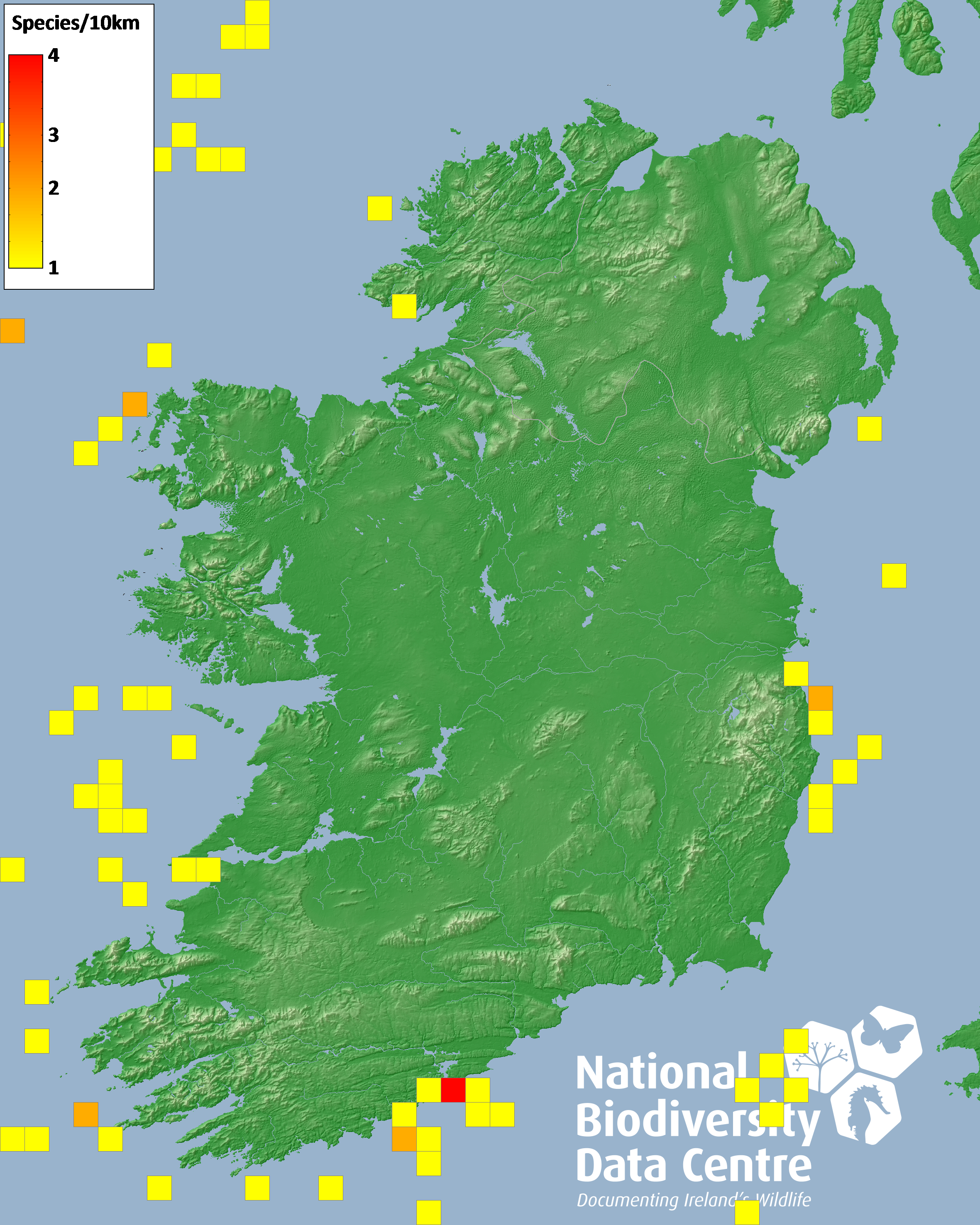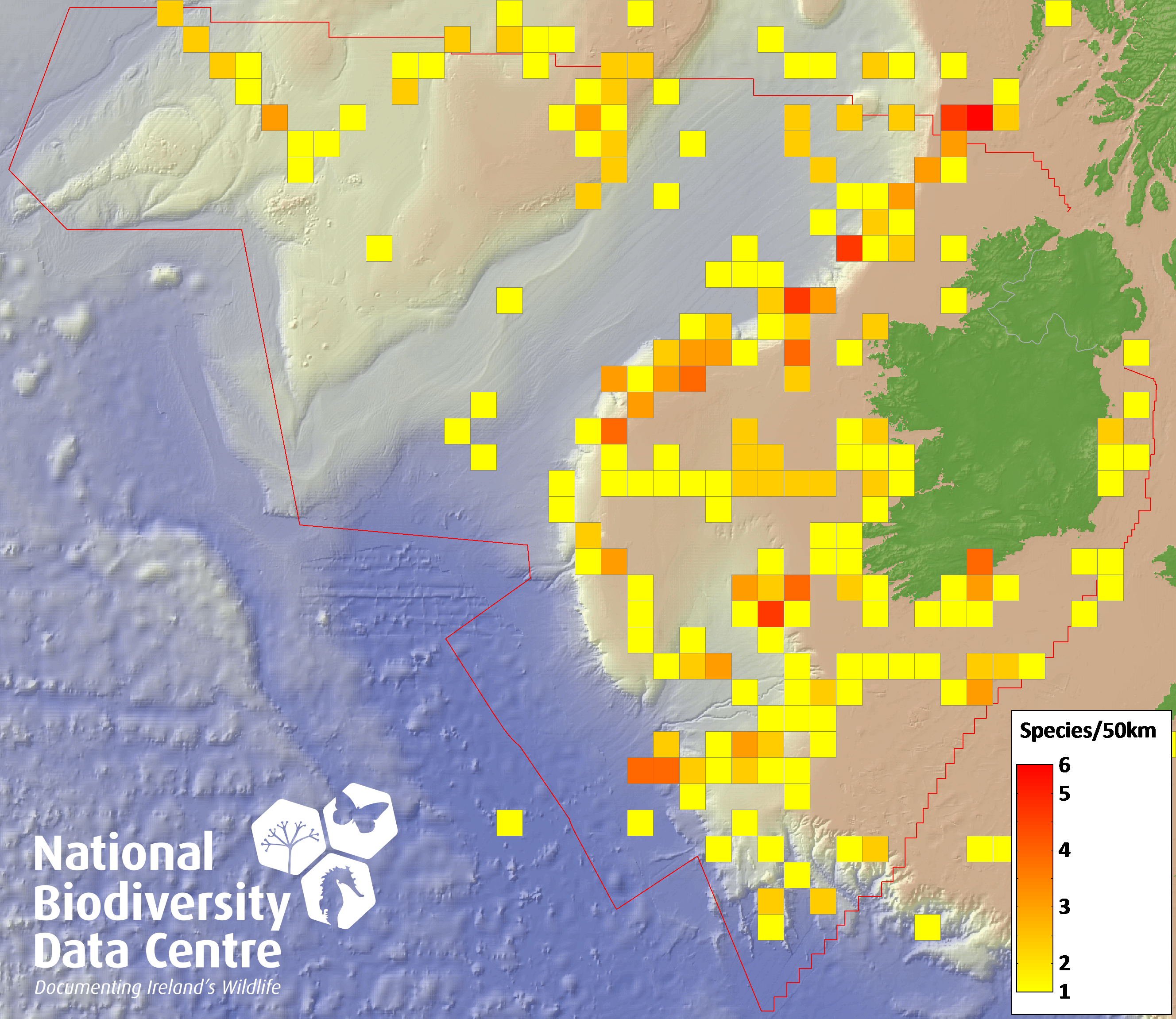 Distribution of the number of species recorded within each 10km grid square (ITM).Marine Map - 50Km