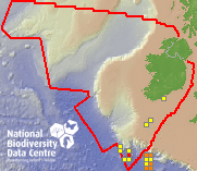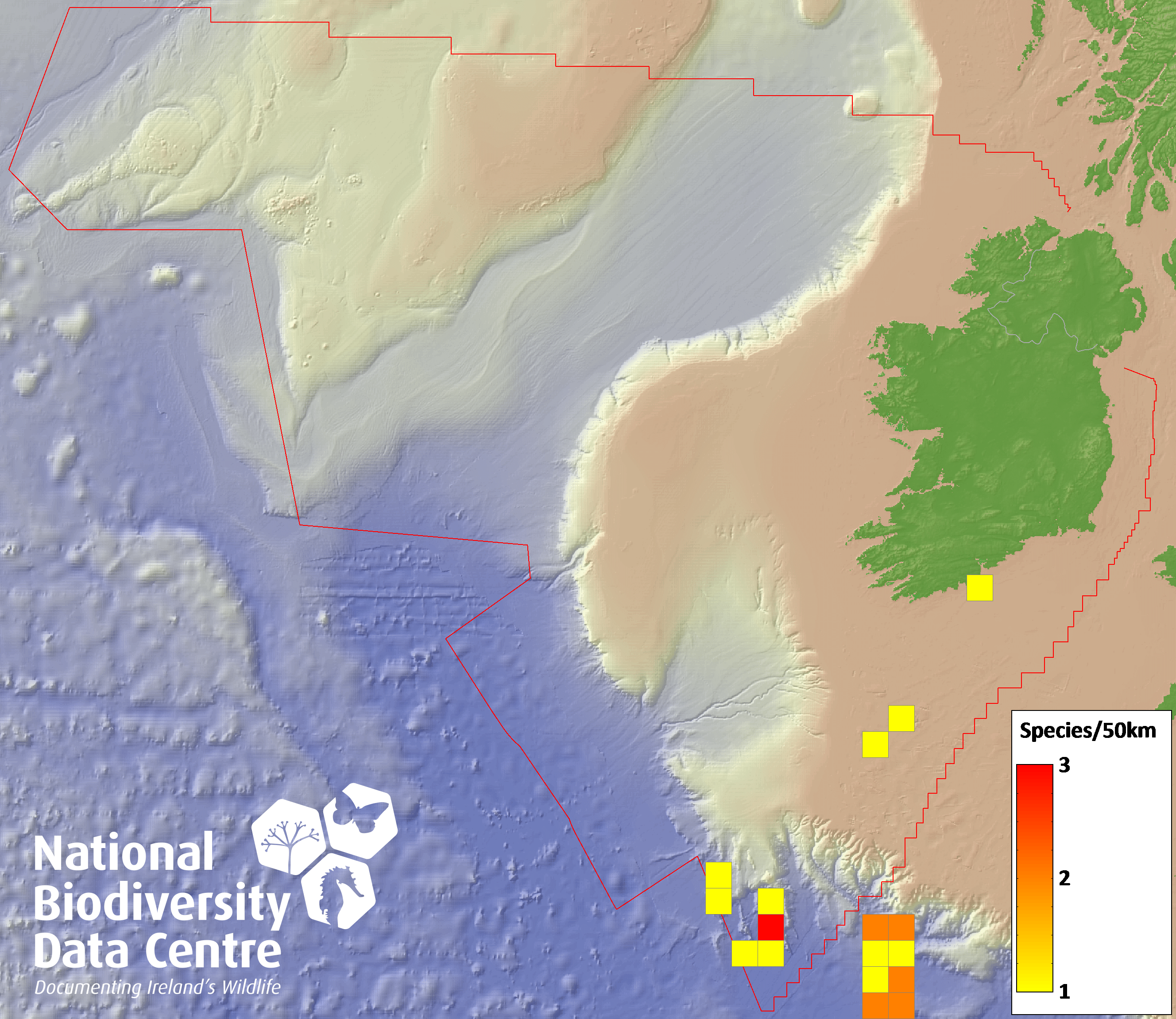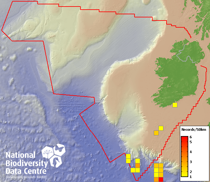 Distribution of the number of records within each 10km grid square (ITM).Marine Map - 50Km