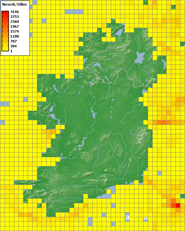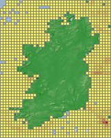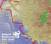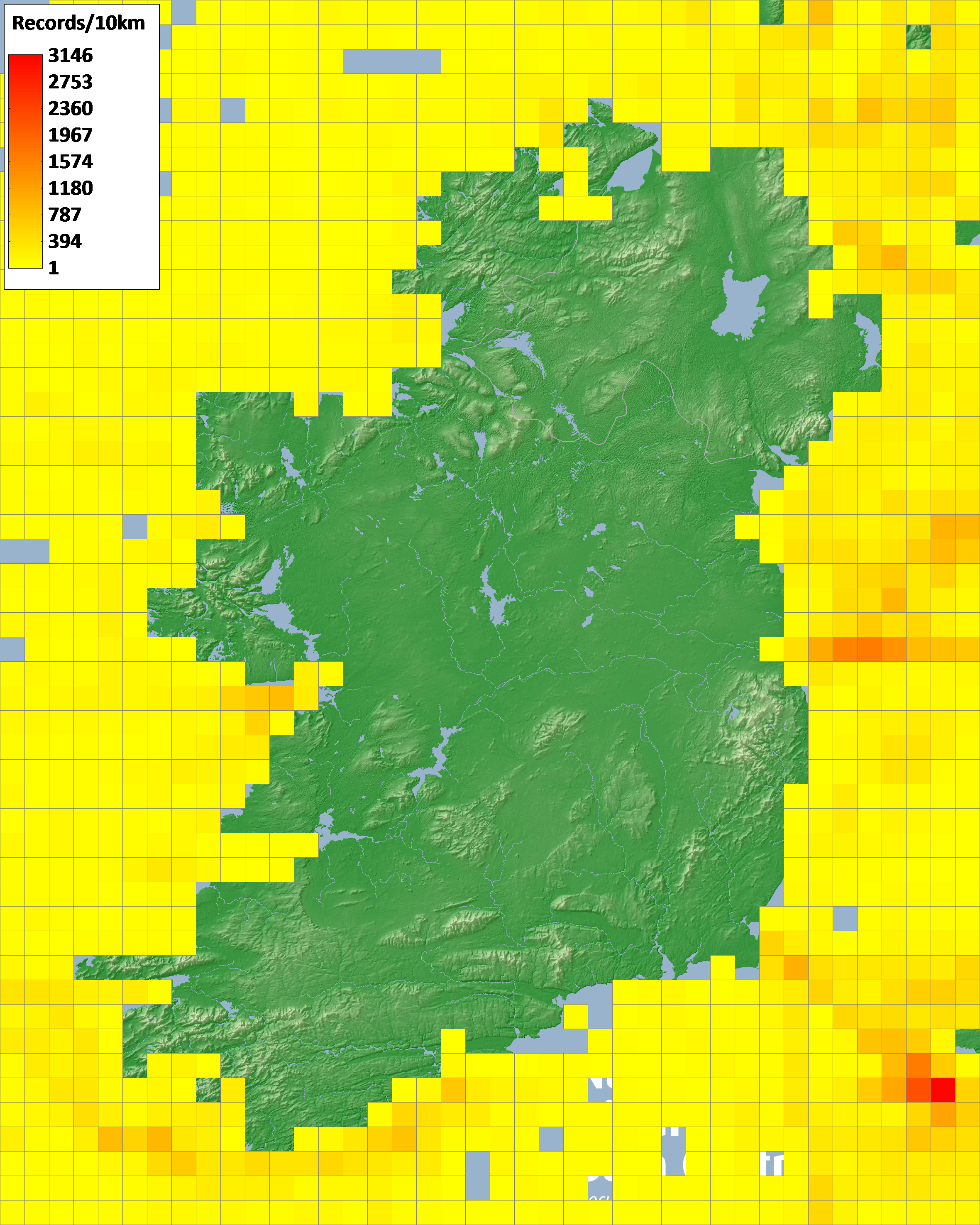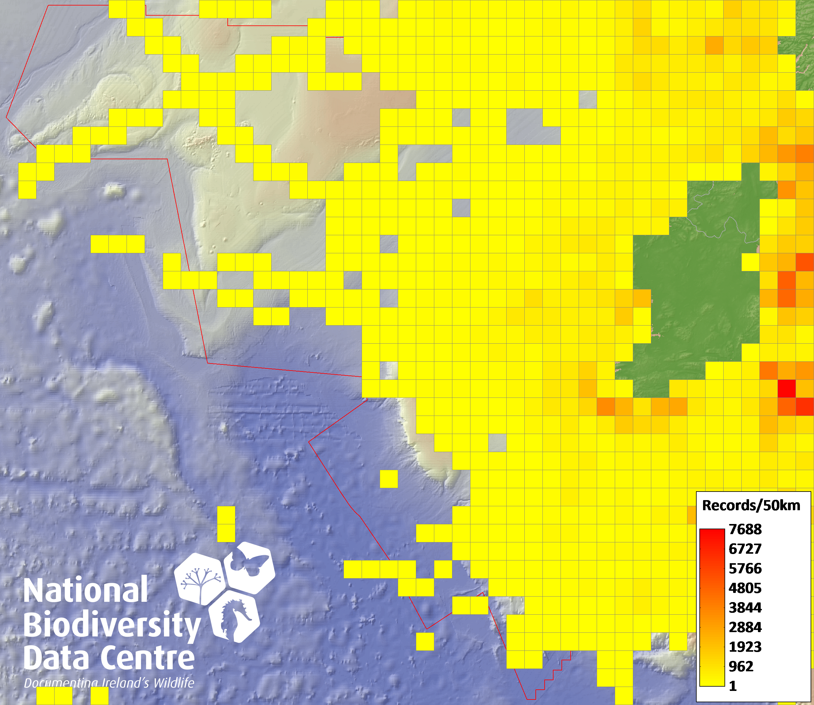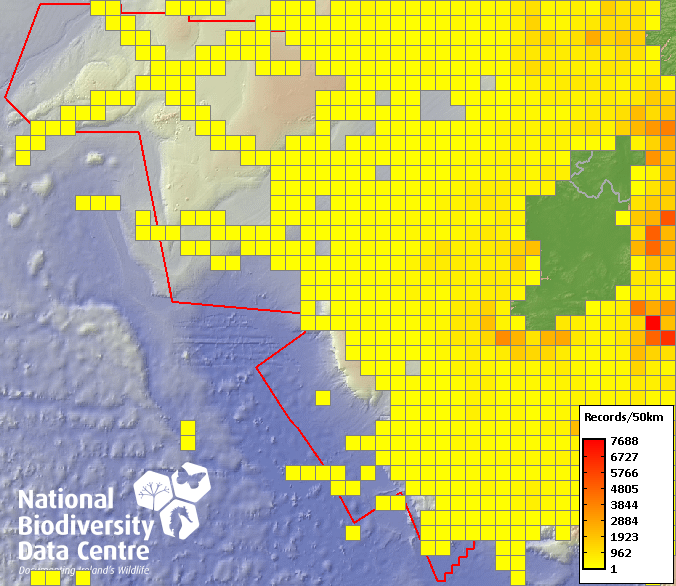 Distribution of the number of records within each 10km grid square (ITM).Marine Map - 50Km