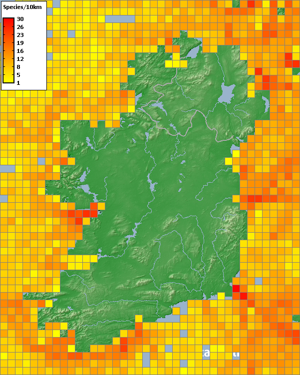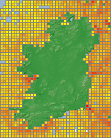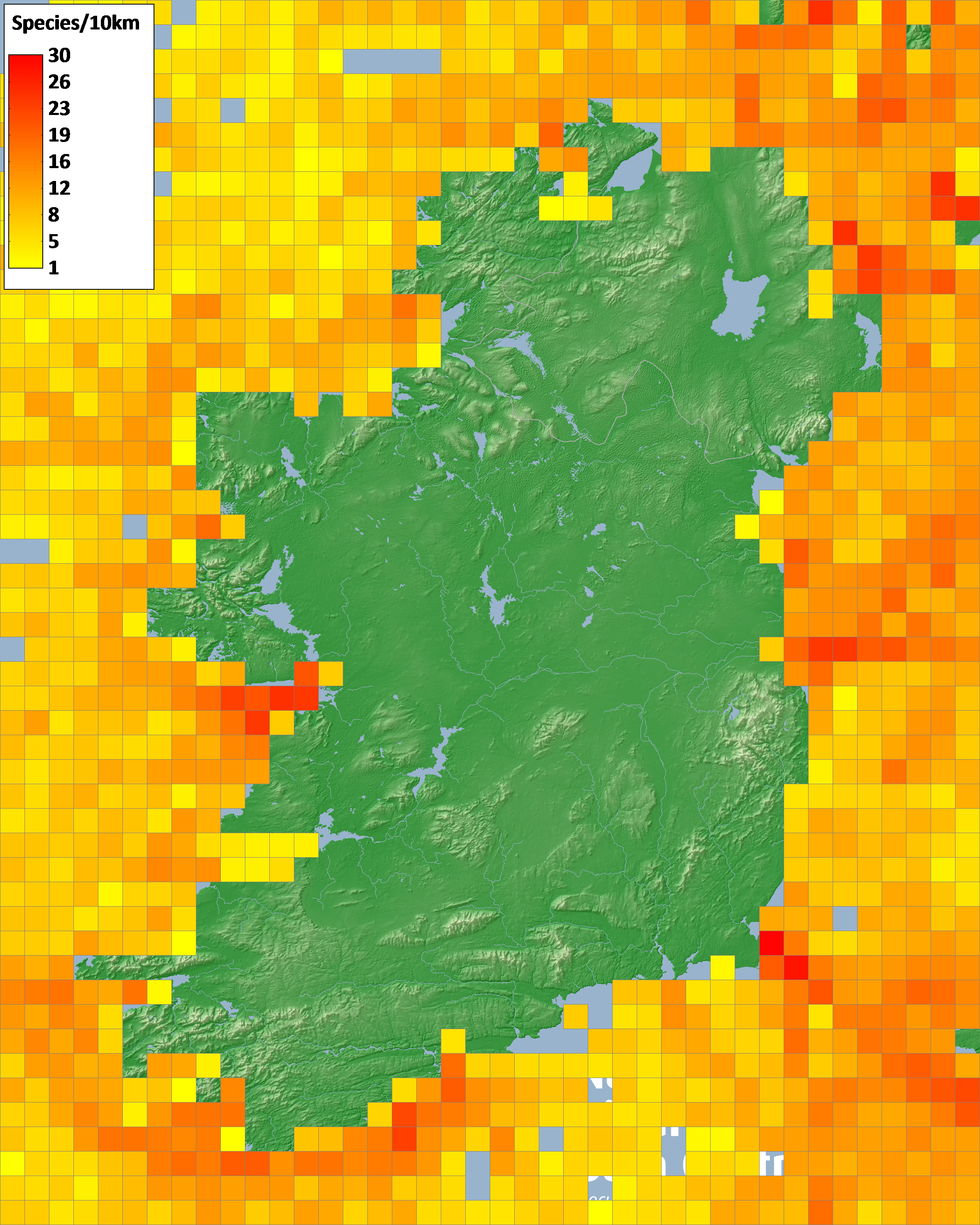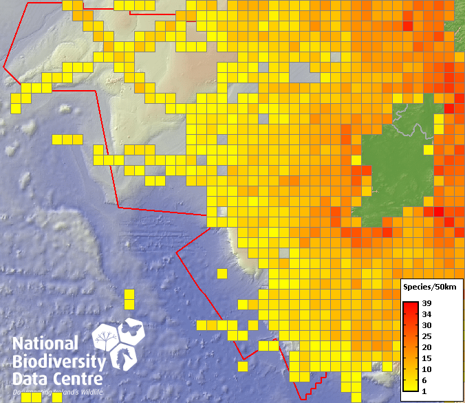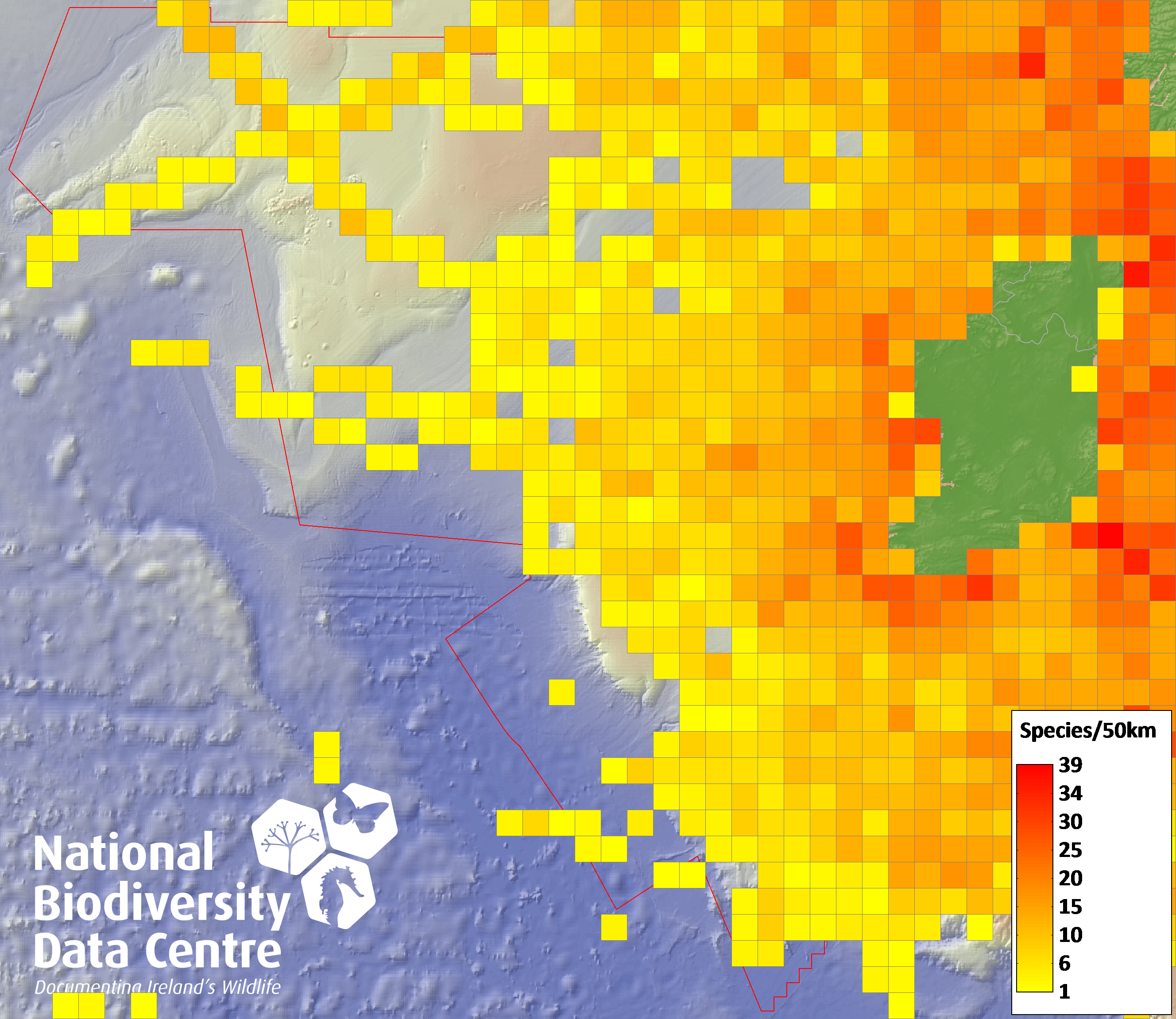 Distribution of the number of species recorded within each 10km grid square (ITM).Marine Map - 50Km