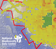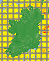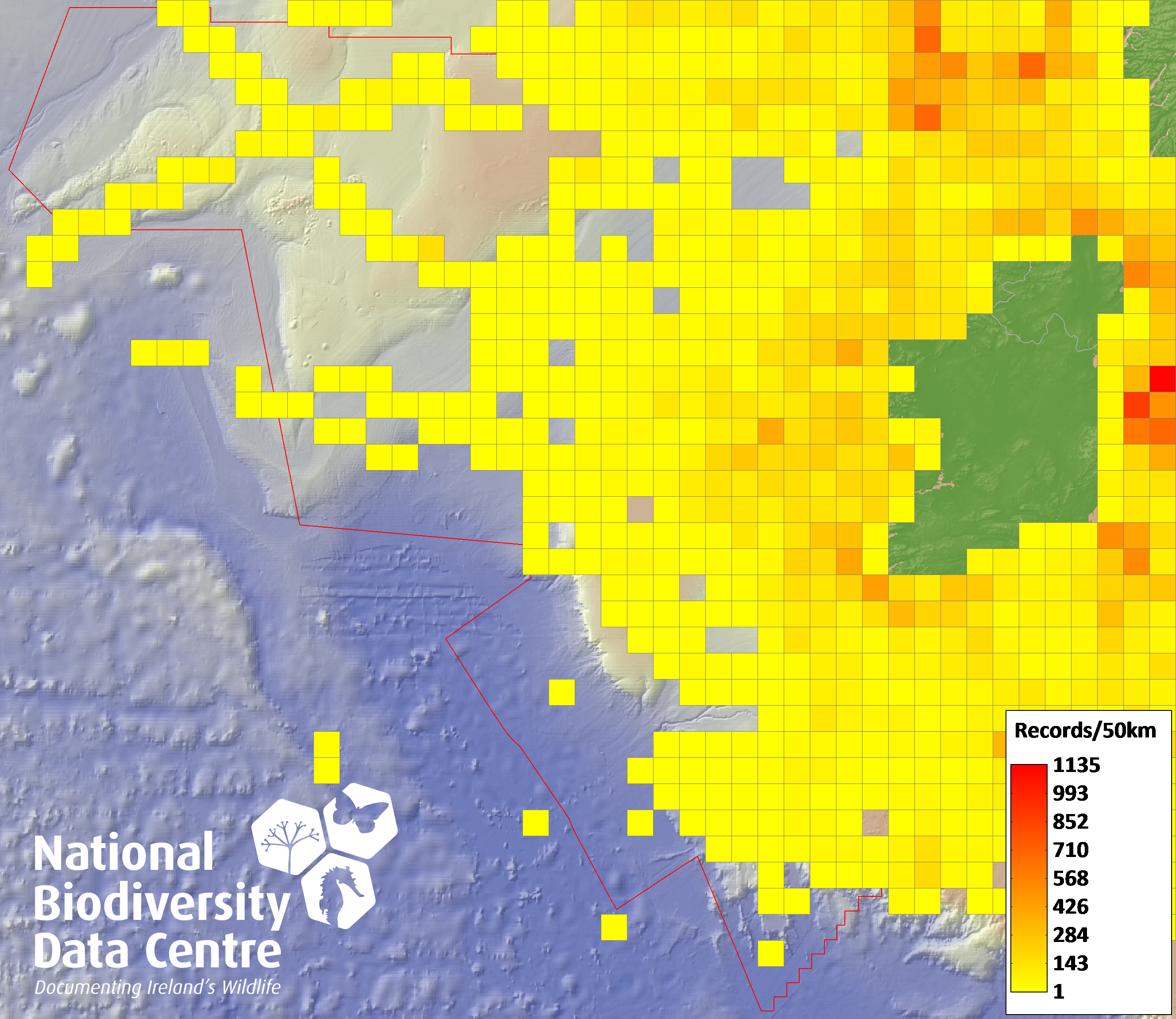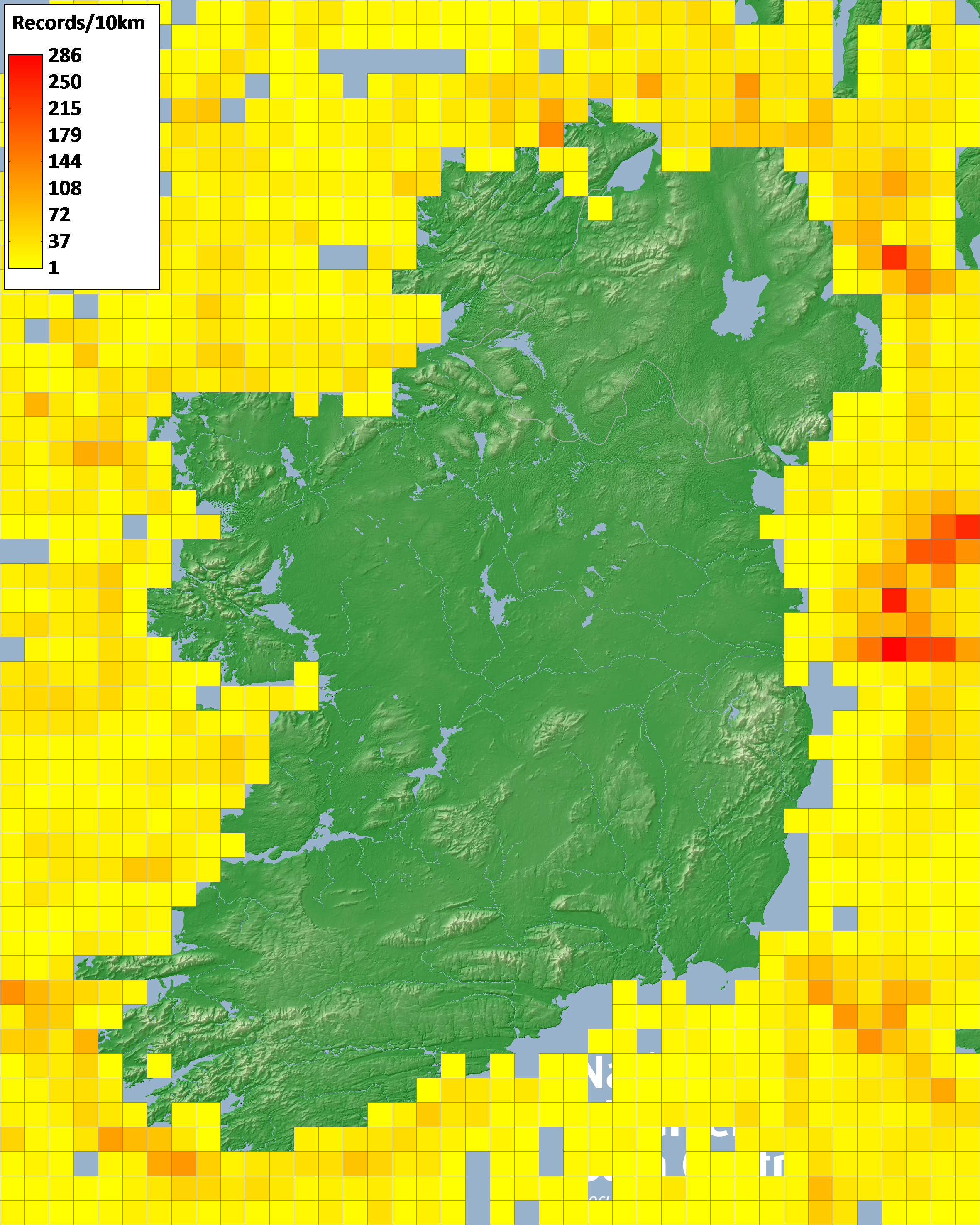 Distribution of the number of records recorded within each 10km grid square (ITM).Marine Map - 50km