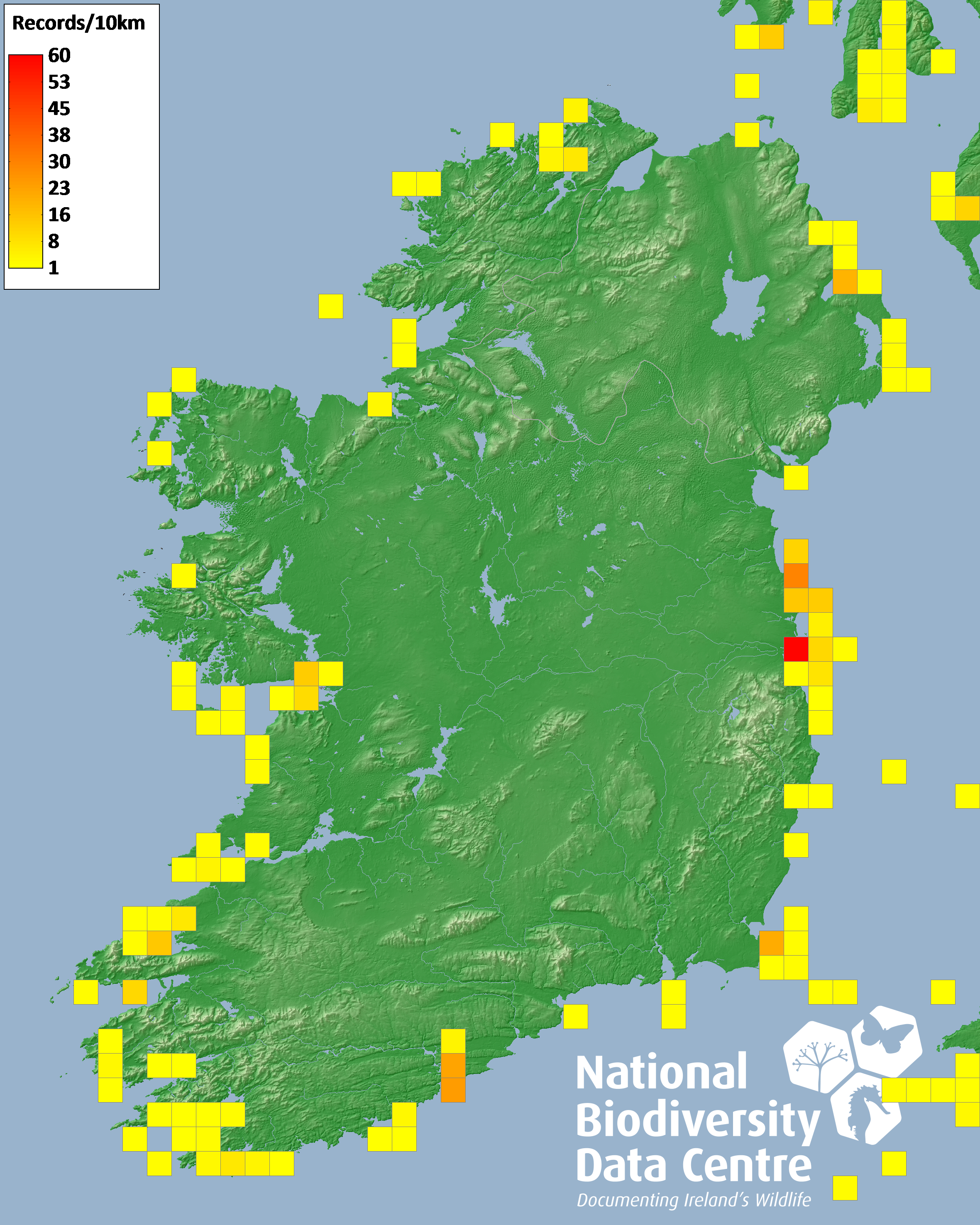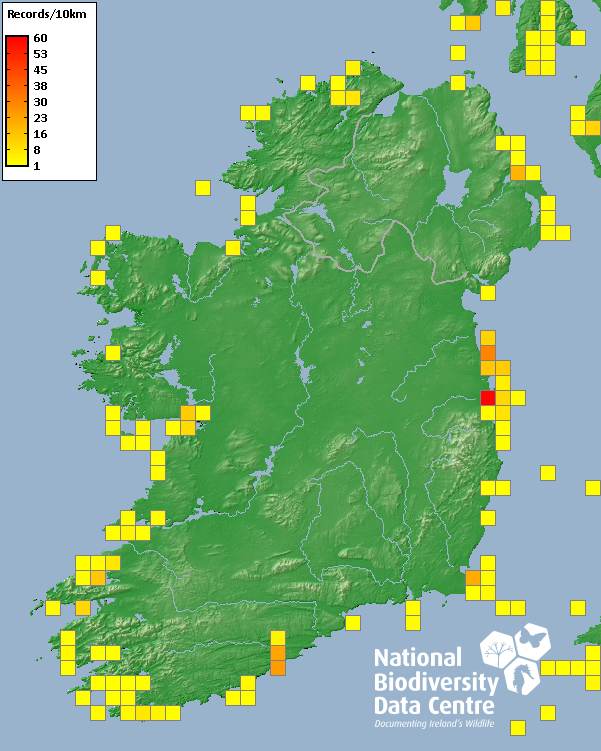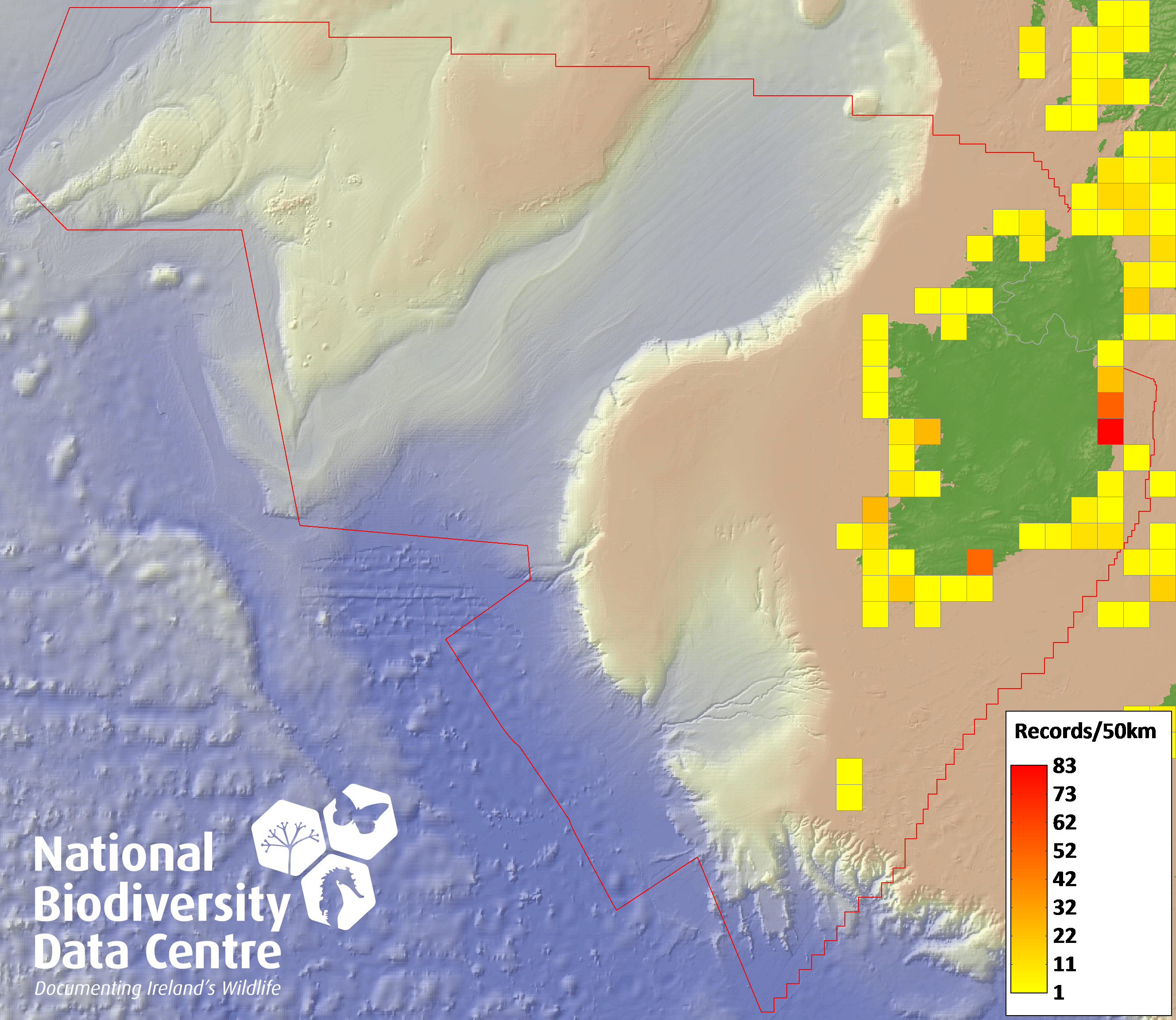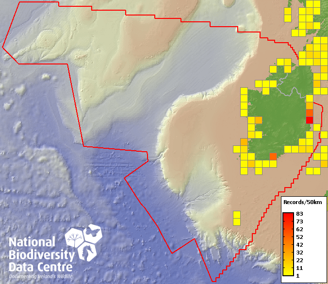 Distribution of the number of records recorded within each 10km grid square (ITM).Marine Map - 50km