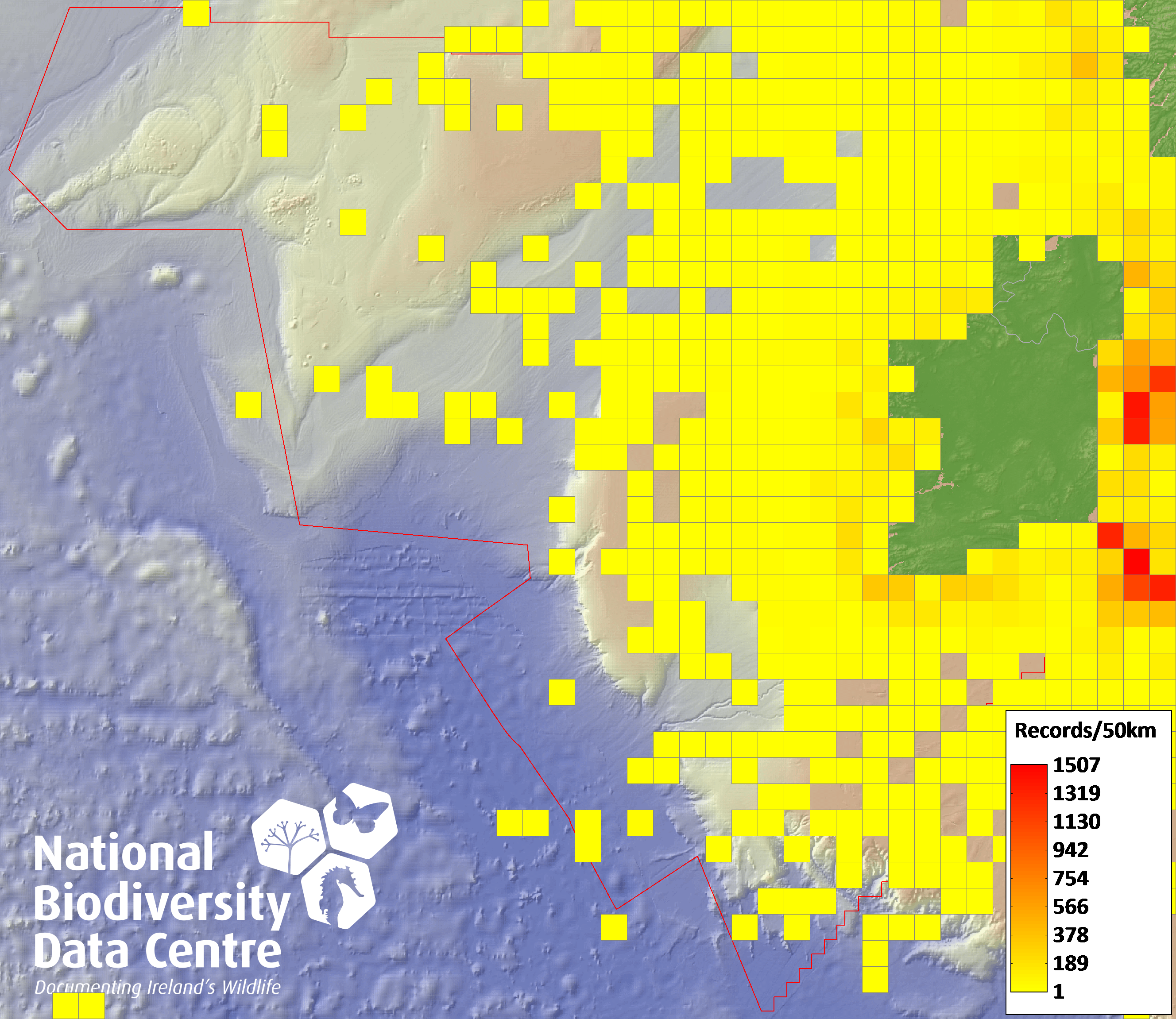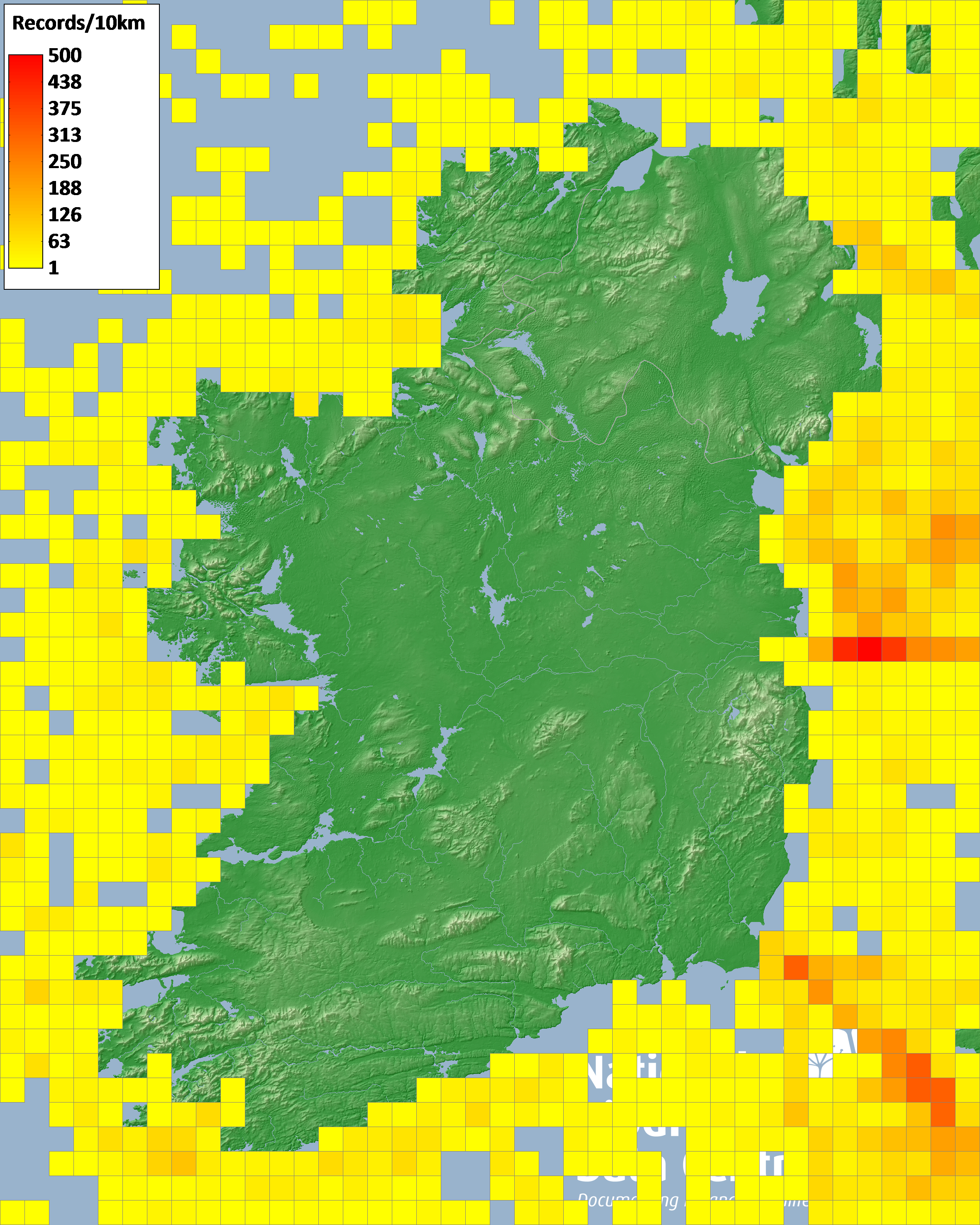 Distribution of the number of records recorded within each 10km grid square (ITM).Marine Map - 50km