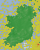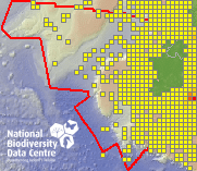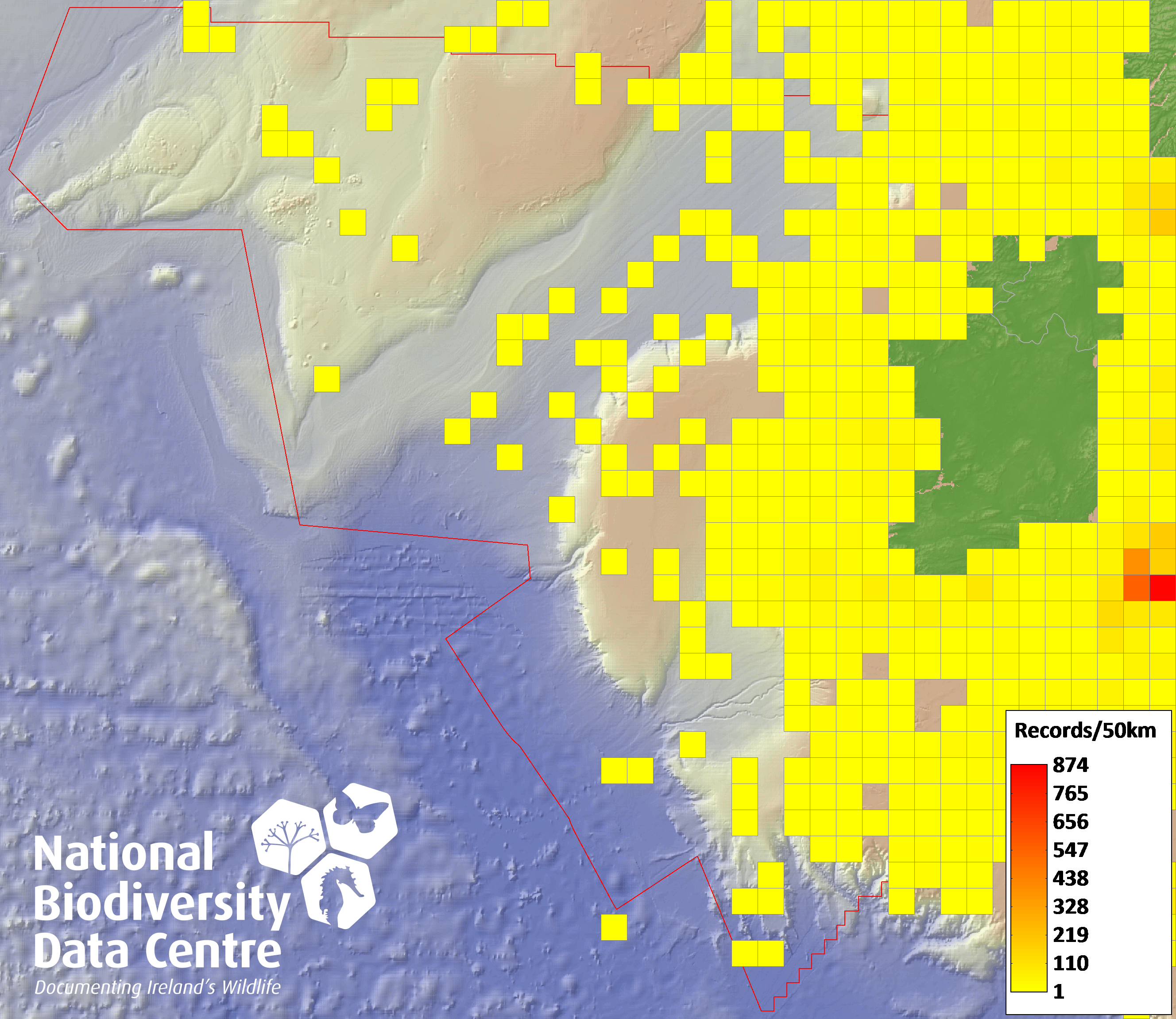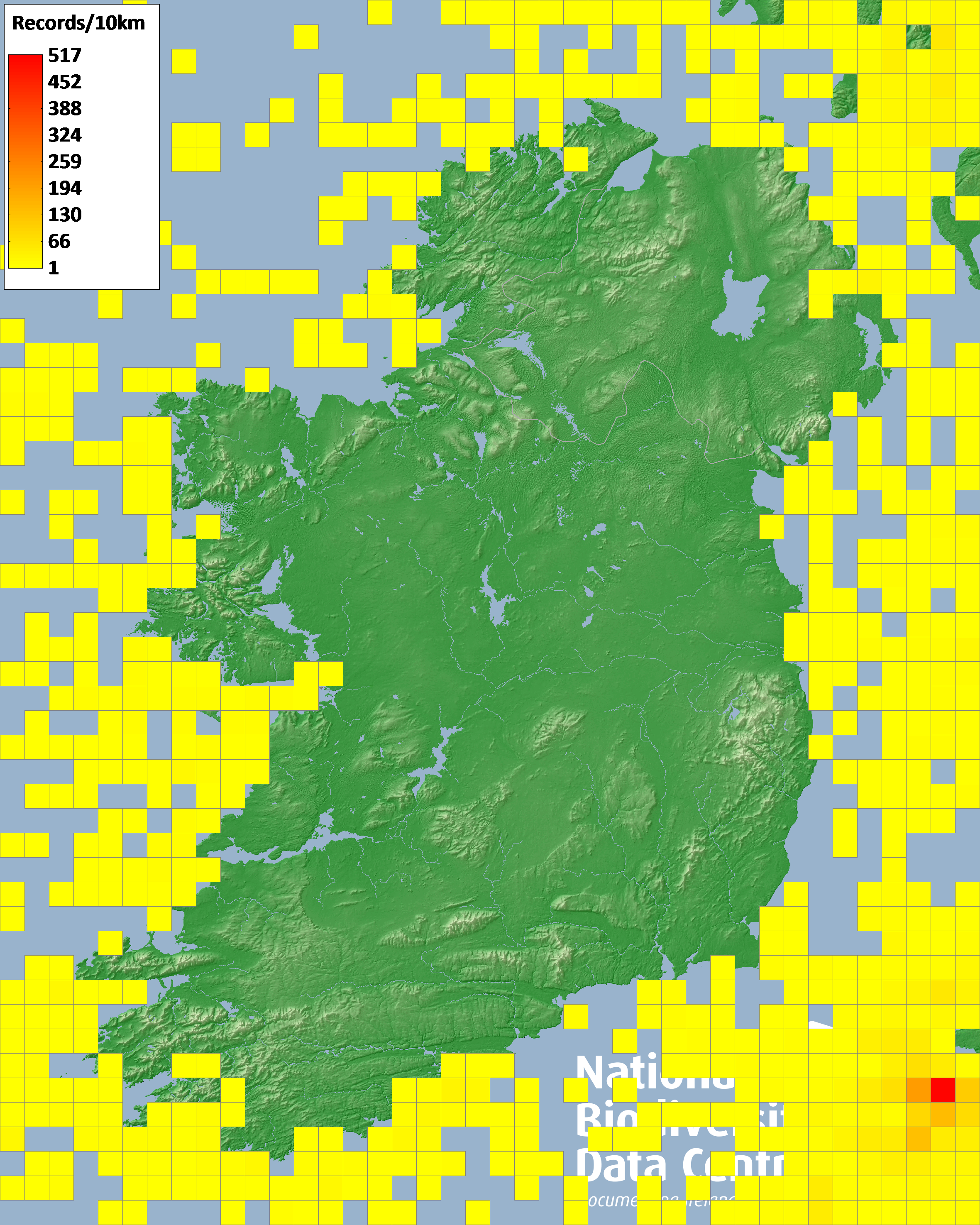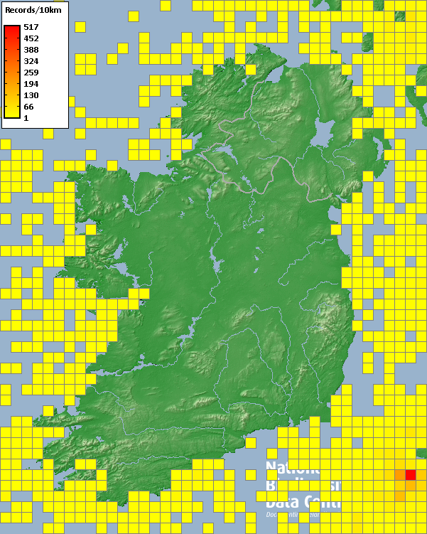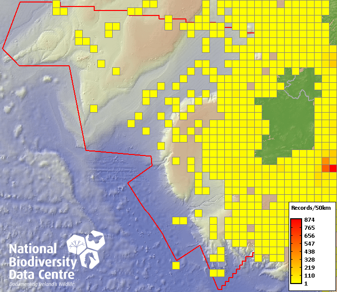 Distribution of the number of records recorded within each 10km grid square (ITM).Marine Map - 50km