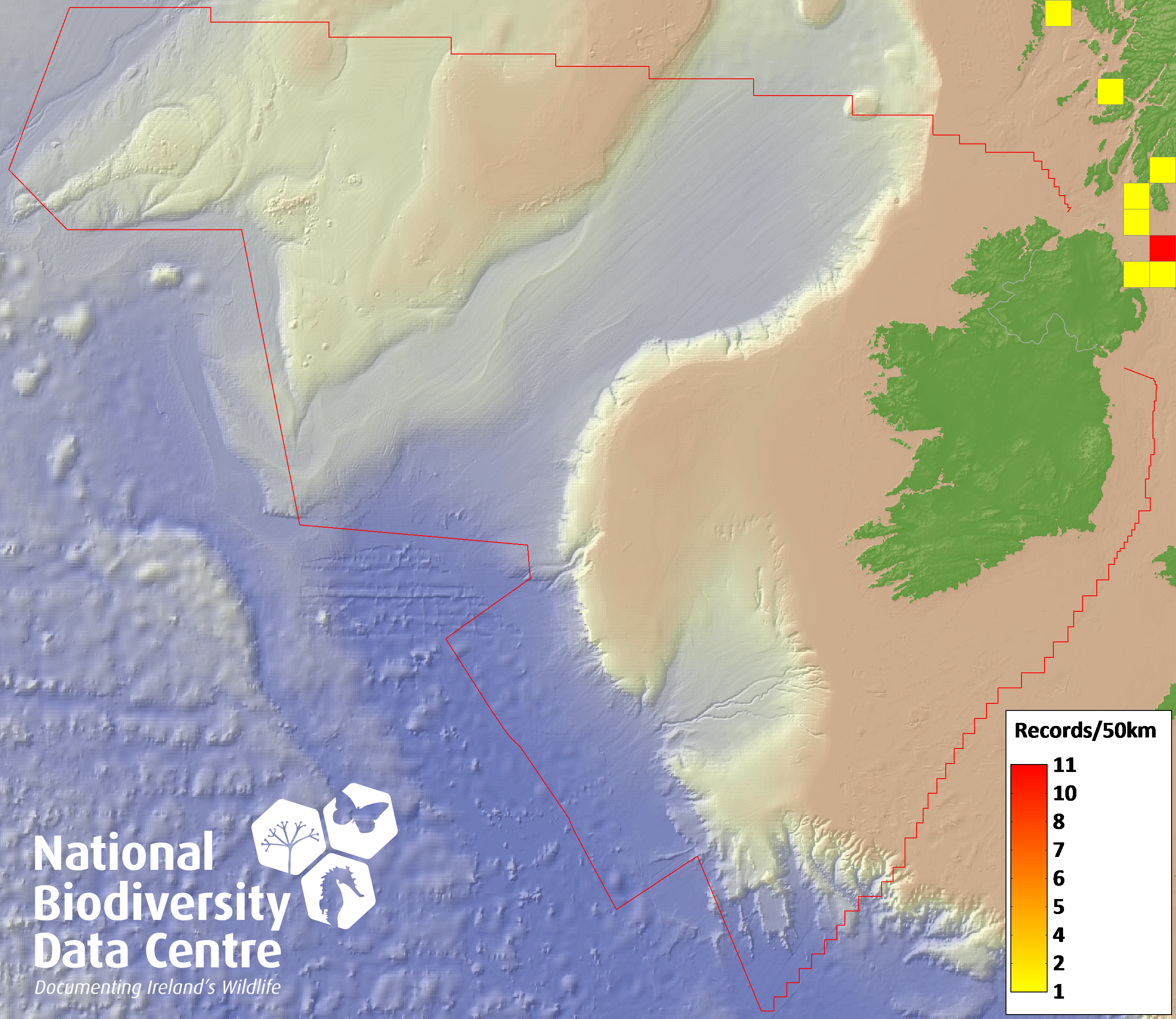 Distribution of the number of records recorded within each 10km grid square (ITM).Marine Map - 50km