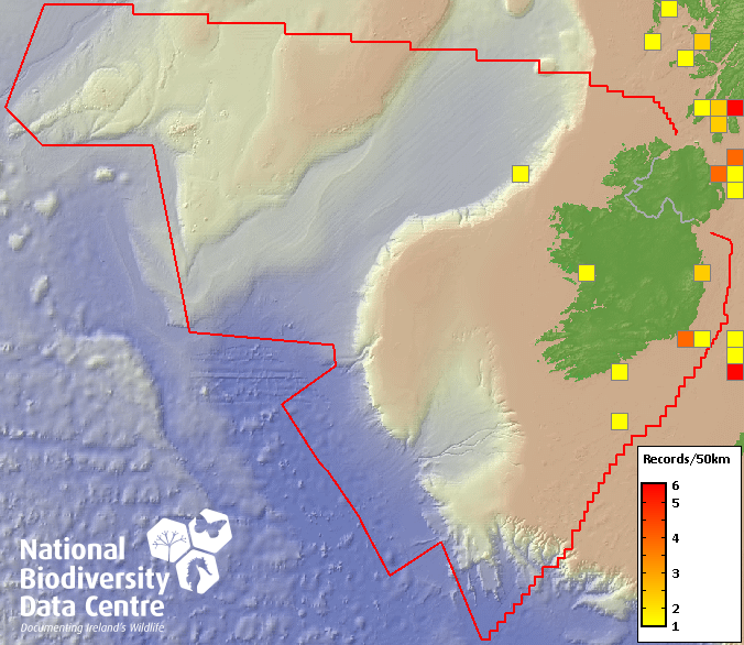 Distribution of the number of records recorded within each 10km grid square (ITM).Marine Map - 50km