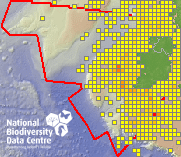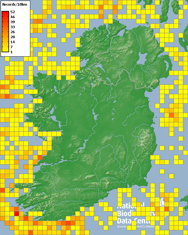 Distribution of the number of records recorded within each 10km grid square (ITM).Marine Map - 50km