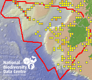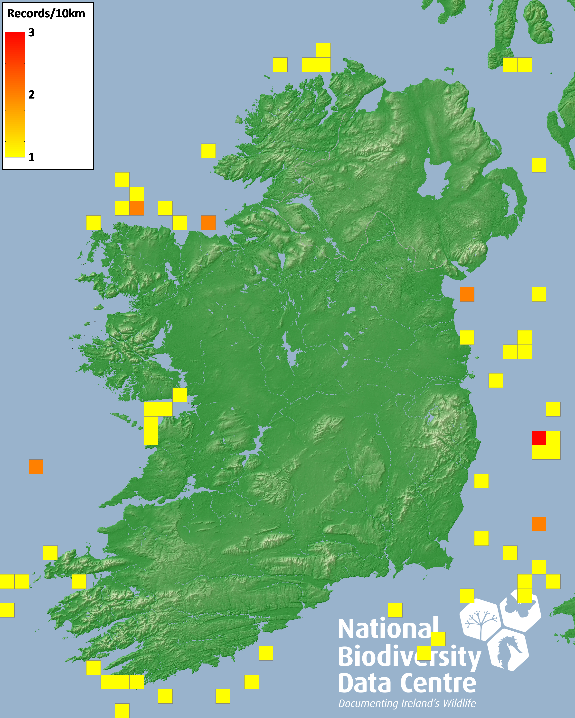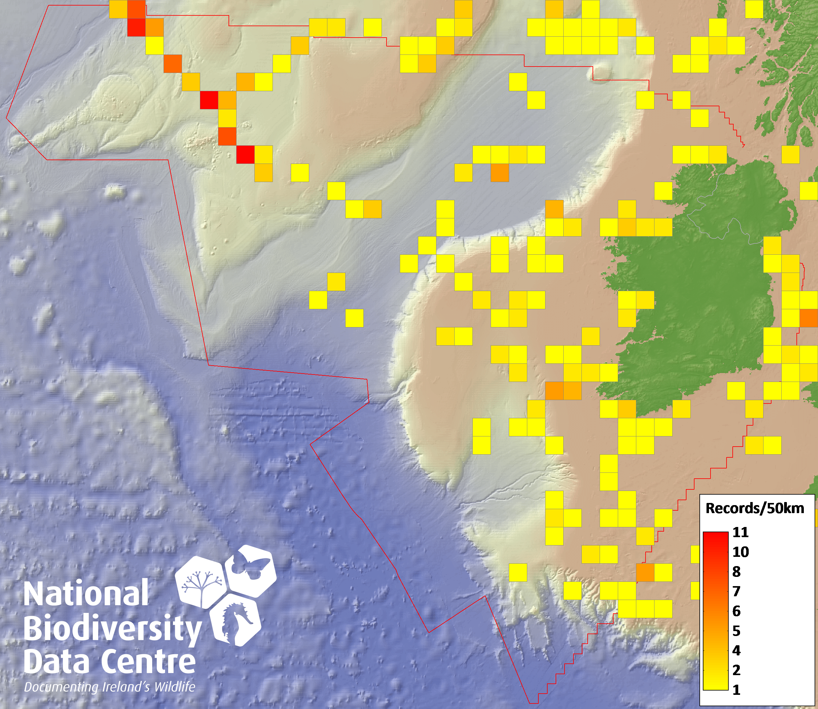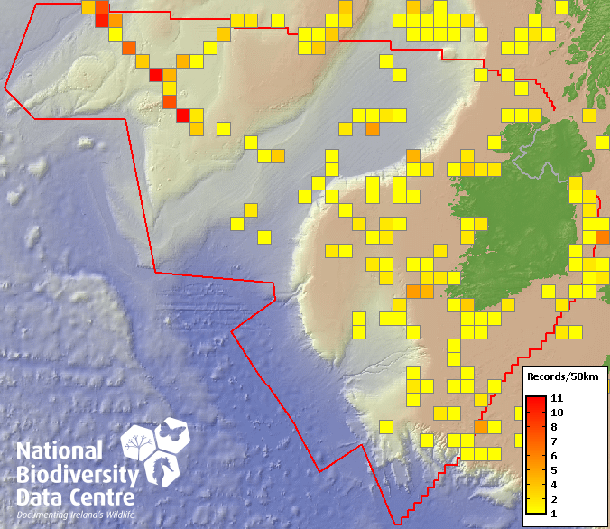Distribution of the number of records recorded within each 10km grid square (ITM).Marine Map - 50km