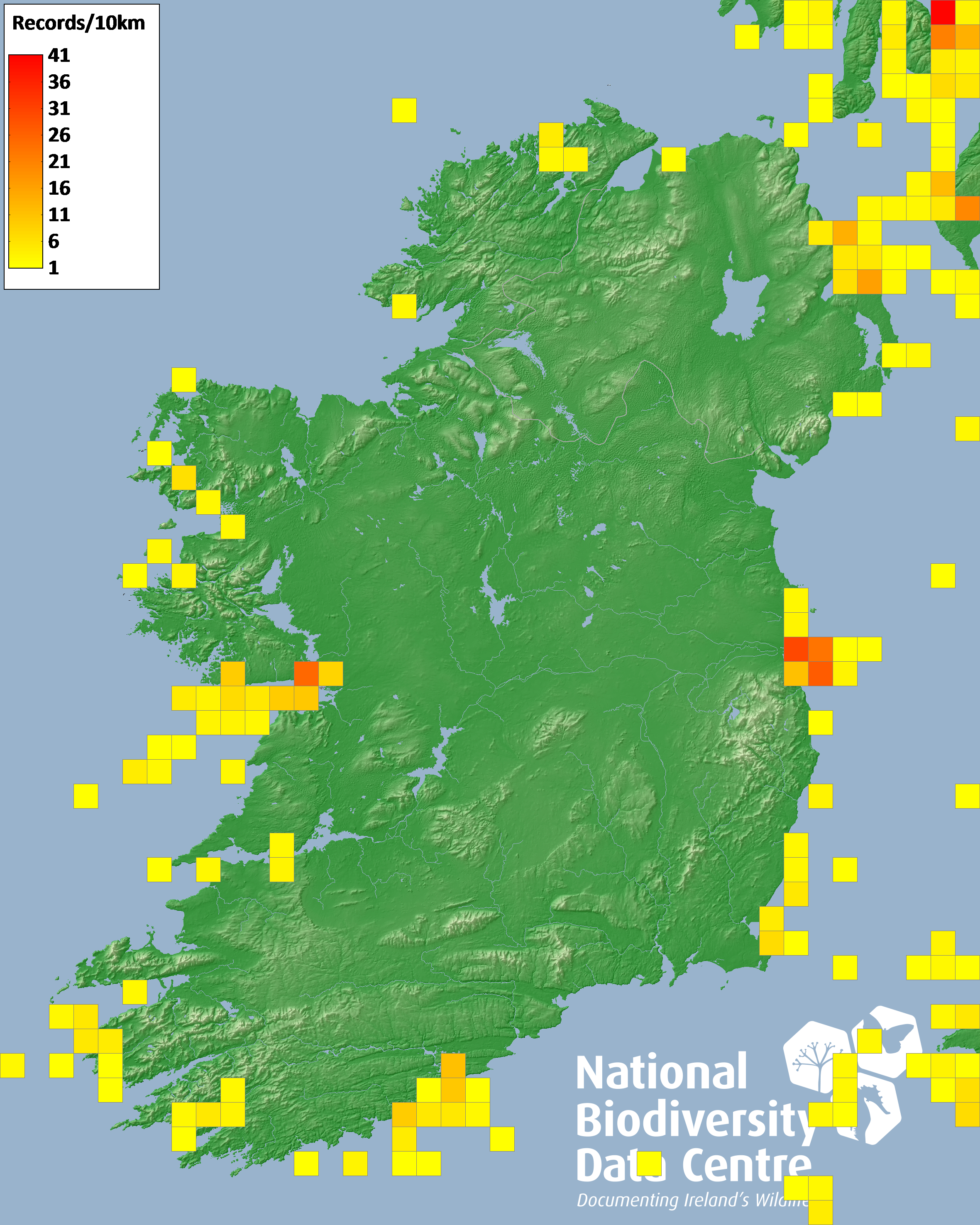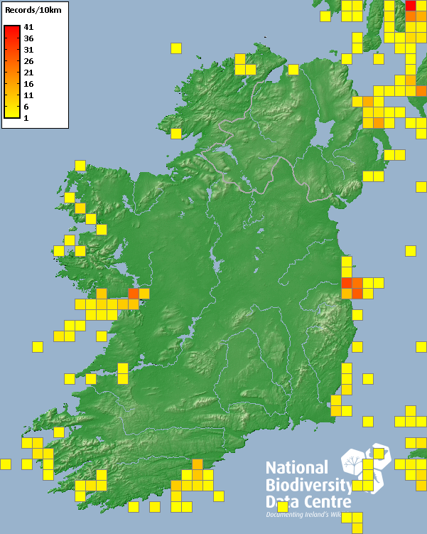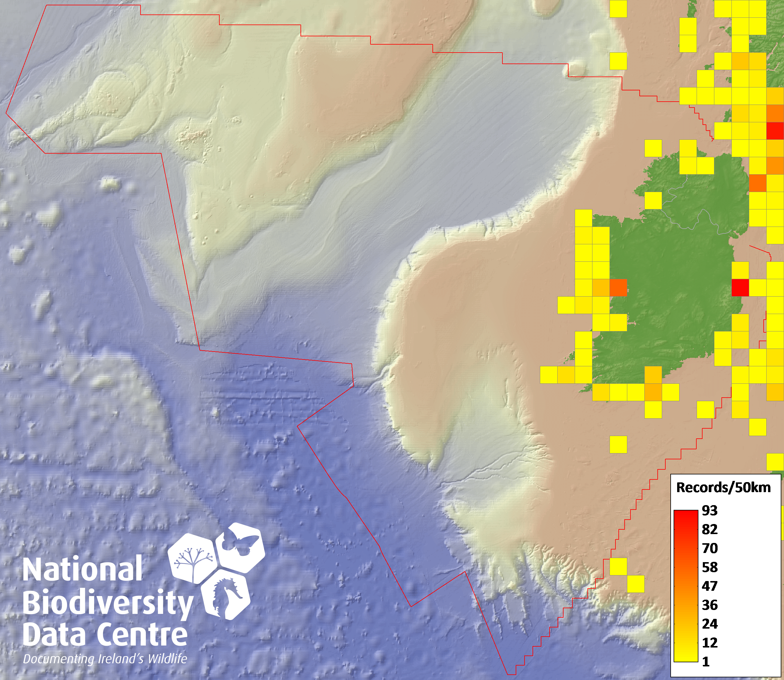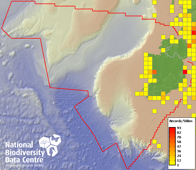 Distribution of the number of records recorded within each 10km grid square (ITM).Marine Map - 50km