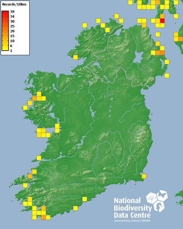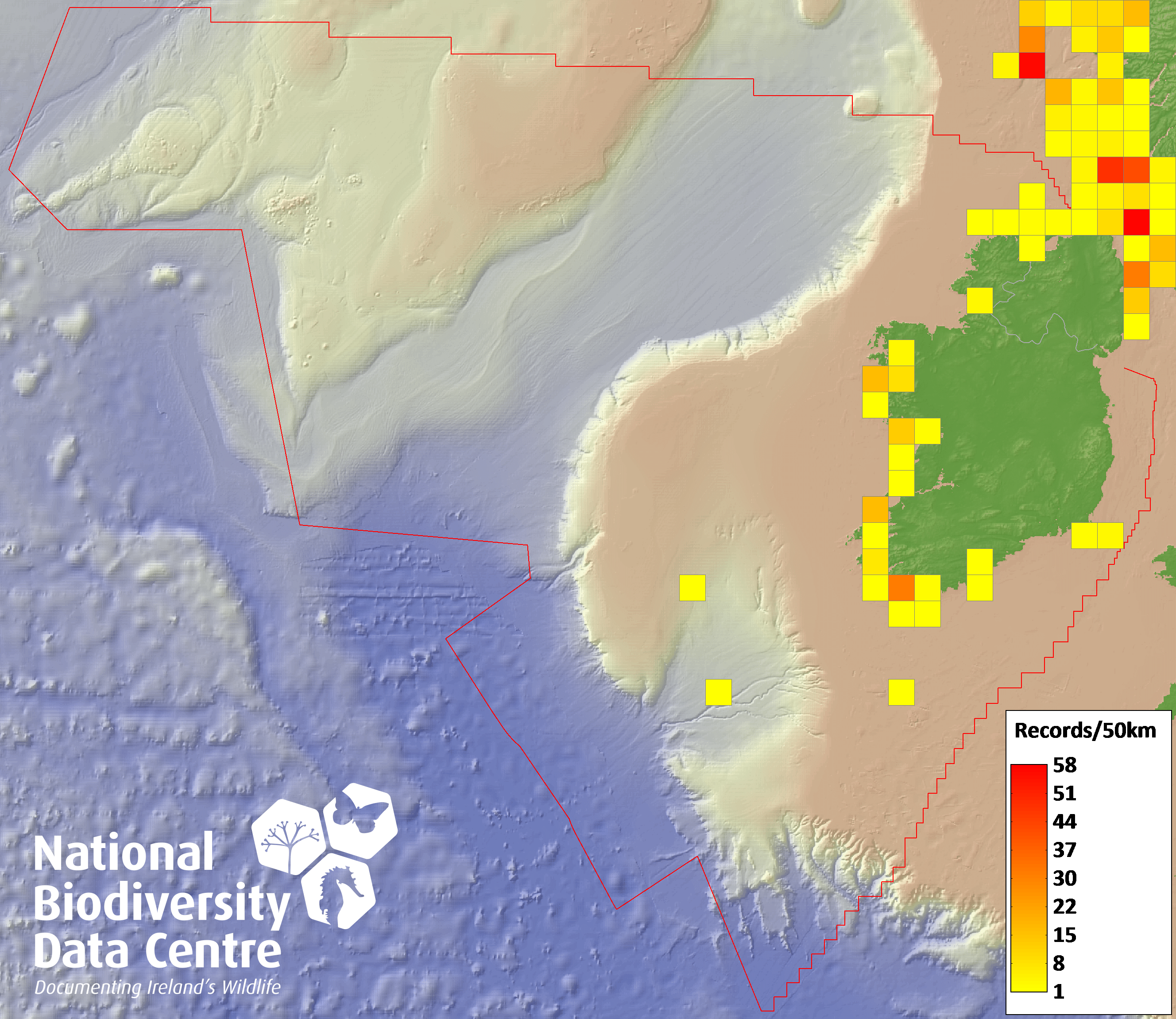 Distribution of the number of records recorded within each 10km grid square (ITM).Marine Map - 50km